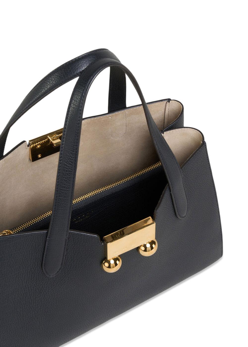 Denne håndvesken kombinerer et tidløst design med funksjonelle detaljer. Det rene skinnet, den markante spennelukkingen og det kontrastfargede interiøret skaper et raffinert uttrykk som passer til enhver anledning.
