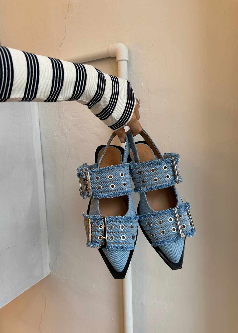 - Blå Mary Jane-sko i bomull med en moderne, firkantet tå.