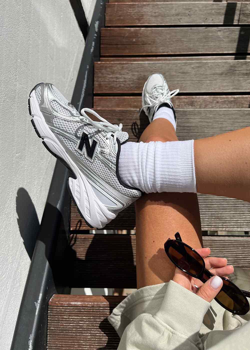 Disse sneakersene kombinerer et tidløst design med moderne detaljer. Den hvite og sølvfargede paletten gjør dem allsidige, mens lissene sikrer en personlig passform for enhver anledning.