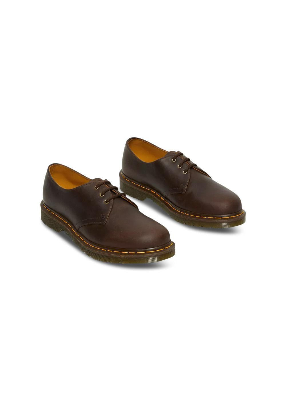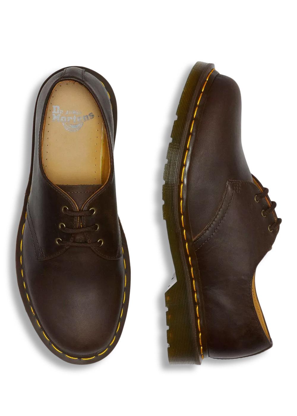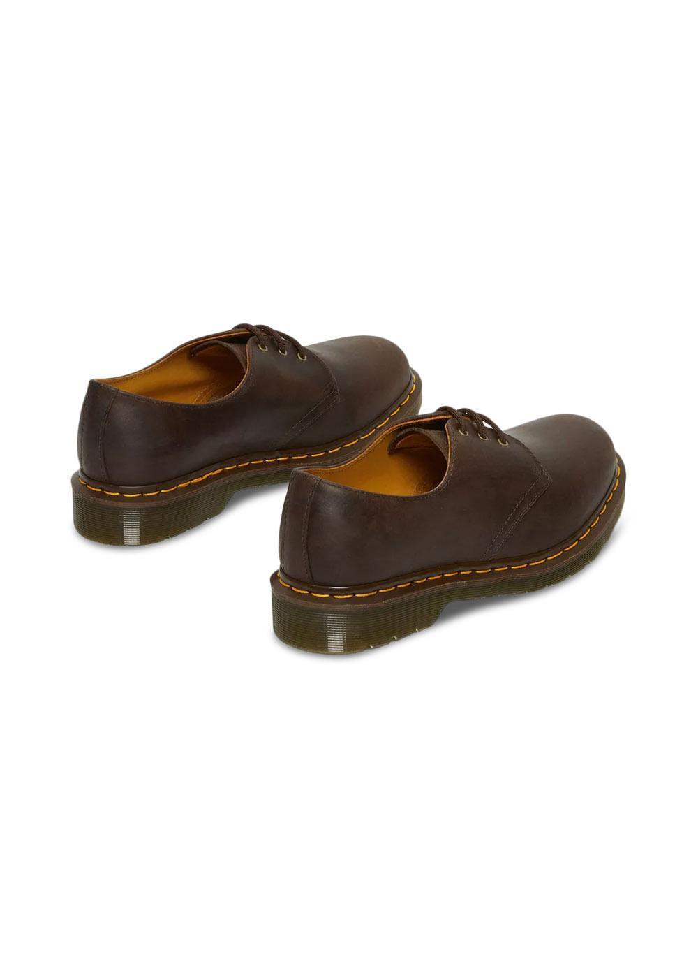 Dr. Martens 1461 er en klassisk sko i mørkebrunt "Crazy Horse"-skinn, som gir et unikt, lett slitt utseende. Den har den ikoniske gule sømmen og en robust såle for et tidløst design.