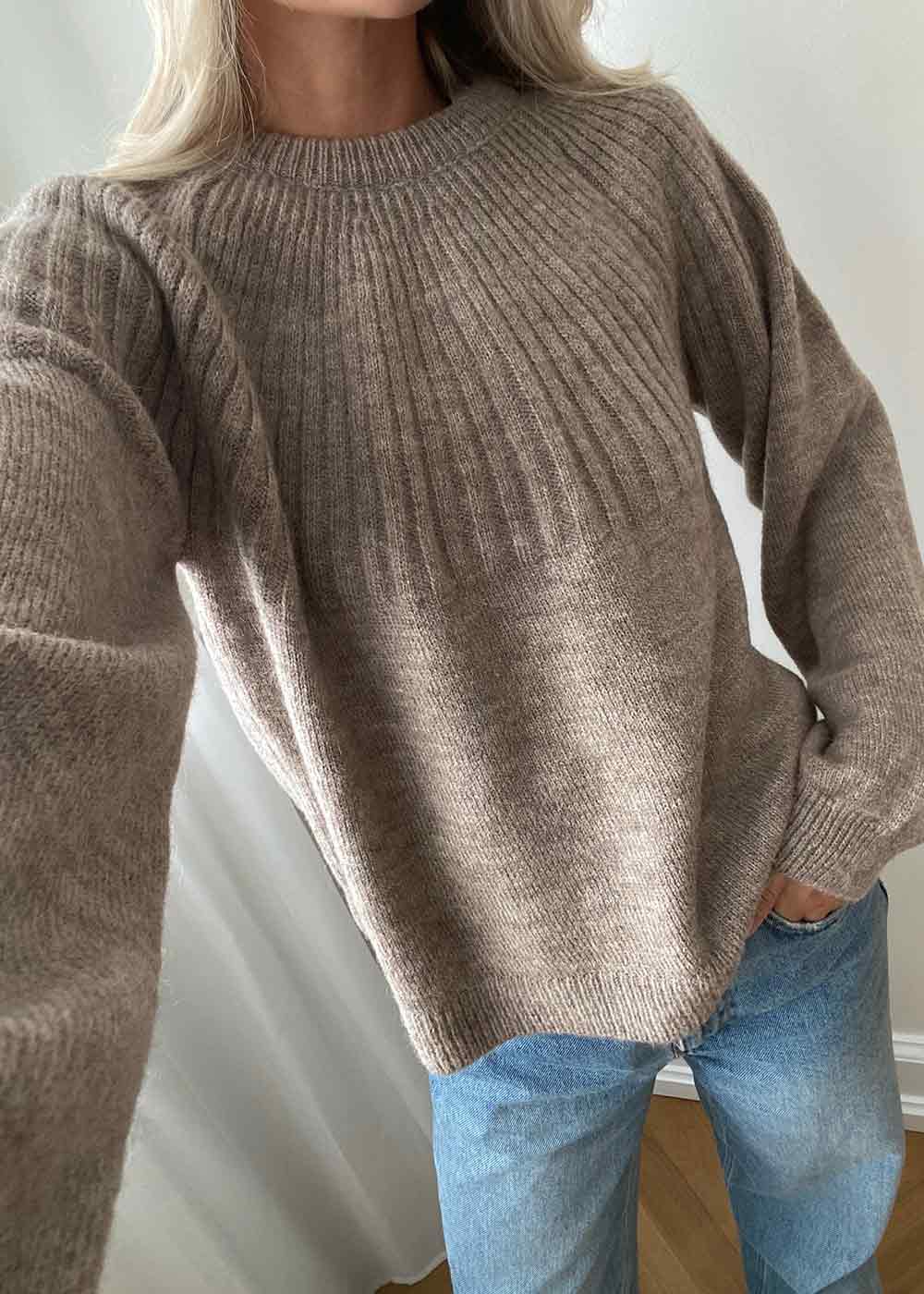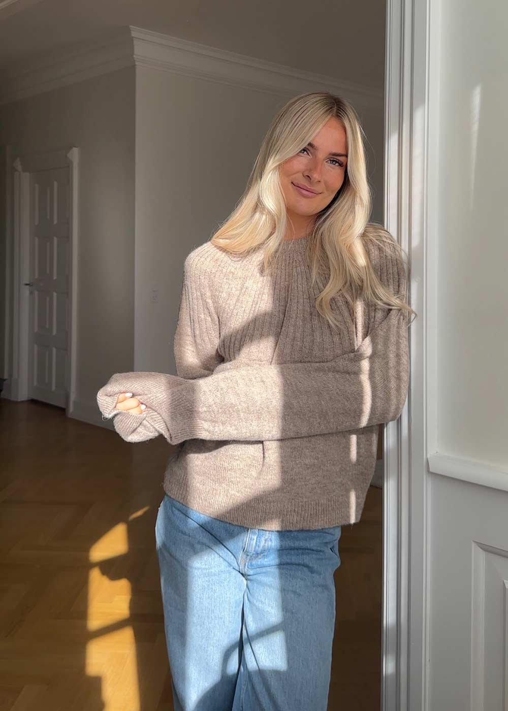Truce O-neck er en deilig strikkegenser med mønster på brystet og ribbekant ved ermene, halsen og bunnen. Denne strikkegenseren er i fargen Beige Melange og kan brukes både på kjølige sommerkvelder og om vinteren.