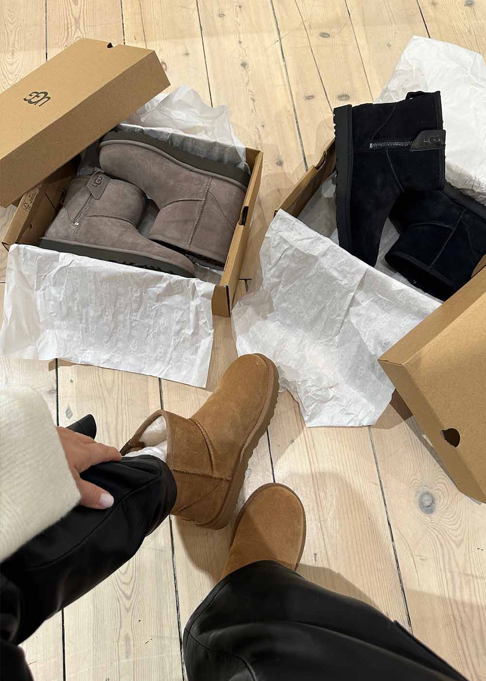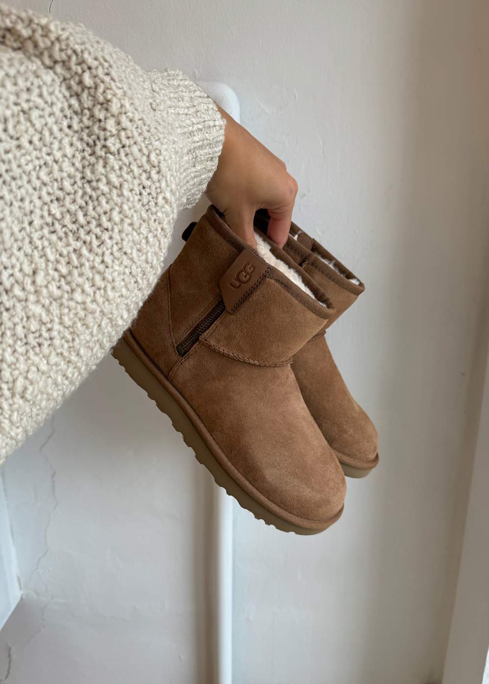 W Classic Mini B Zip fra UGG er en myk og varm støvel i semsket skinn med ullfôr. Støvelen er svært behagelig å ha på og har en glidelås som gjør den enkel å ta av og på. W Classic Mini B Zip har logo øverst ved glidelåslukkingen samt på hælen.