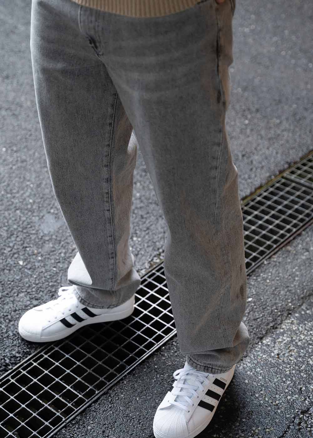 Disse jeansene kombinerer en avslappet passform med et markant 90-tallsdesign. Den grå acid washen gir et rått uttrykk som er ideelt for hverdagsbruk og lett å style for en personlig look.