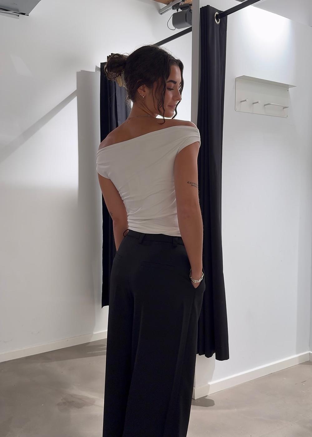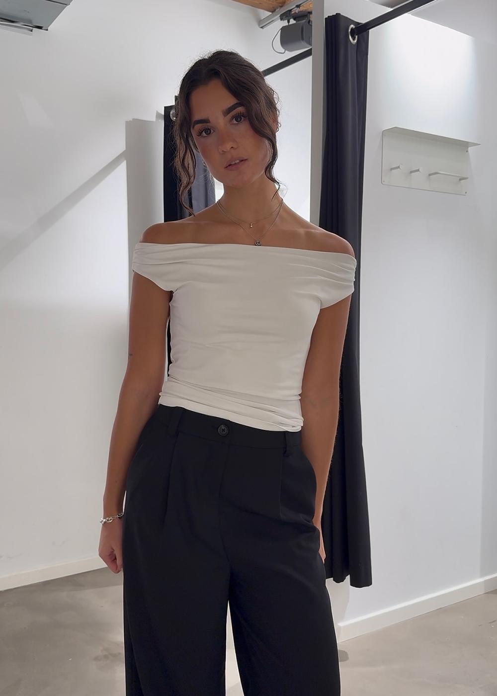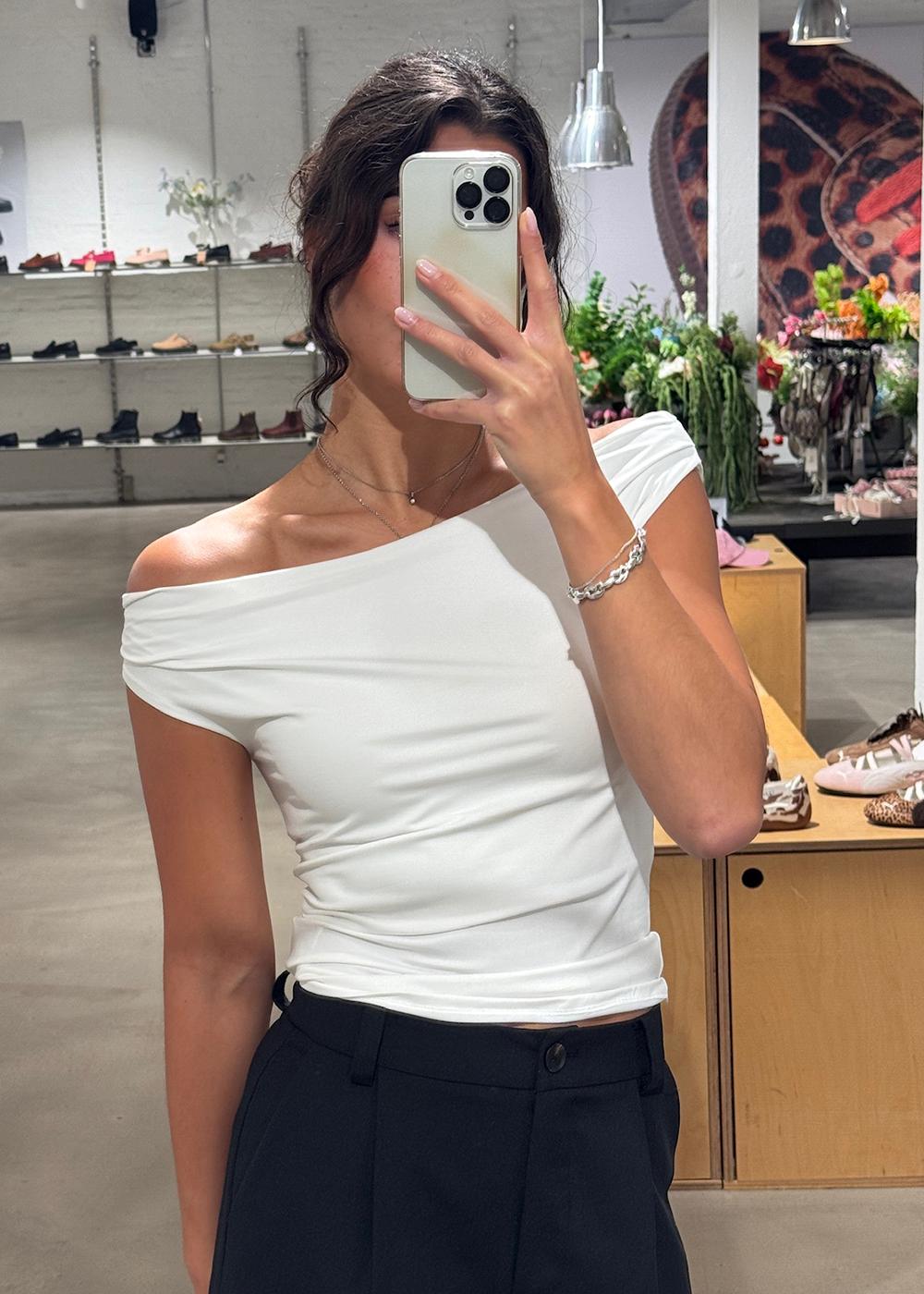 Modstrøms off-shoulder topp i Soft White kombinerer klassisk stil med moderne eleganse. Laget av 95% resirkulert polyester og 5% elastan, tilbyr den en stretchy og komfortabel passform. Perfekt for både hverdagsbruk og festlige anledninger.