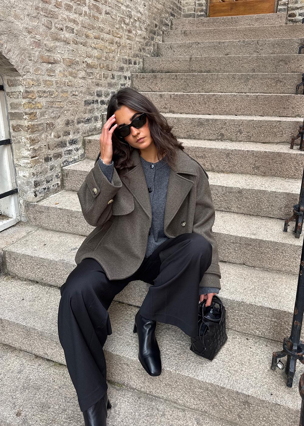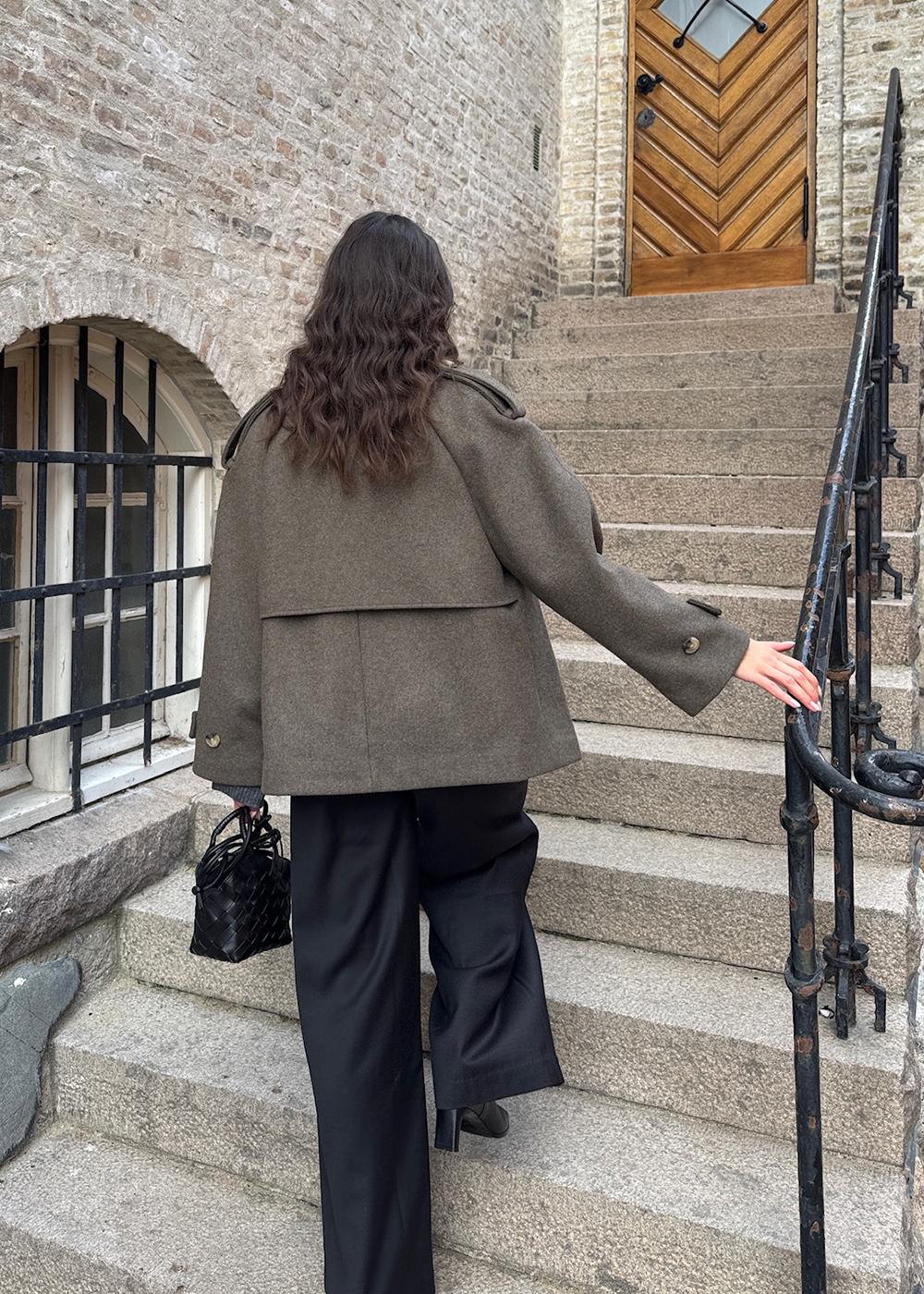 EsmundMD er en dobbeltspent ullfrakk med skjult knappelukking og fôr. Jakken er kort, har klassiske frakkedetaljer med raglanerm og et bredt bærestykke bak.