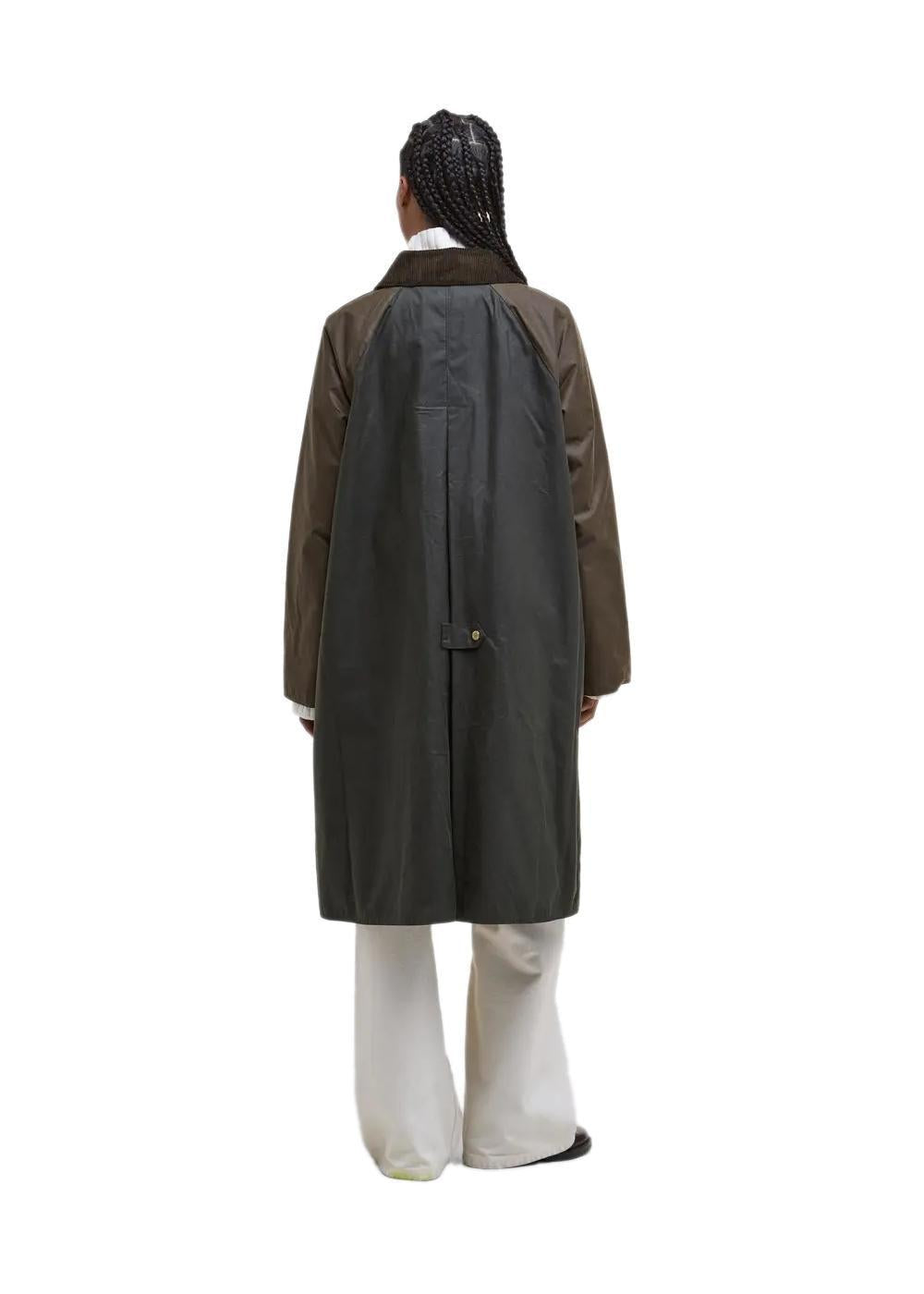 Barbour Evette Wax Jacket er en klassisk, lang frakk i en flott fargekombinasjon av grønt og brunt. Designet er både tidløst og funksjonelt med en elegant fløyelskrage, perfekt til hverdagsbruk i all slags vær.
