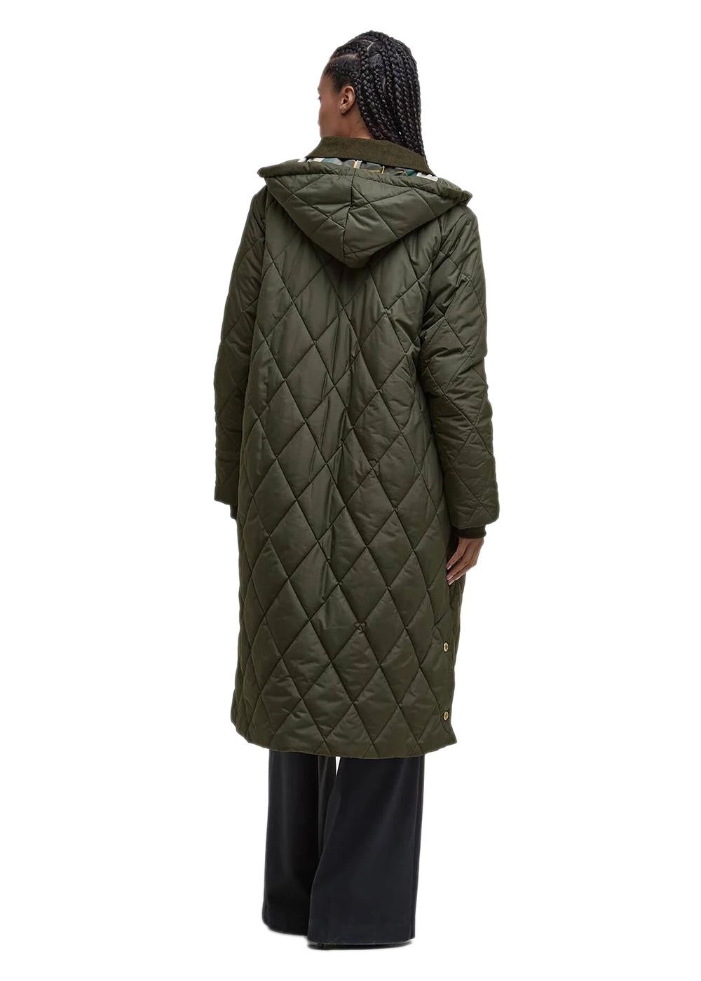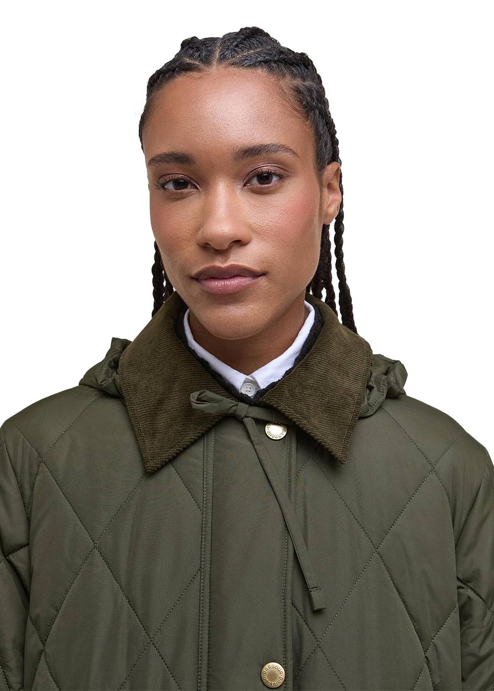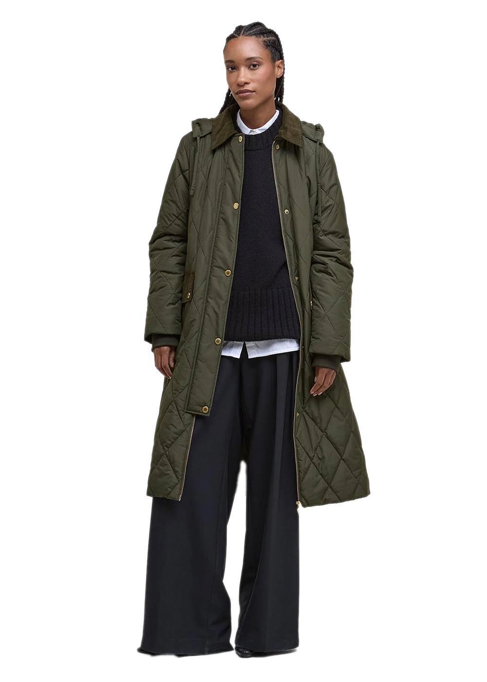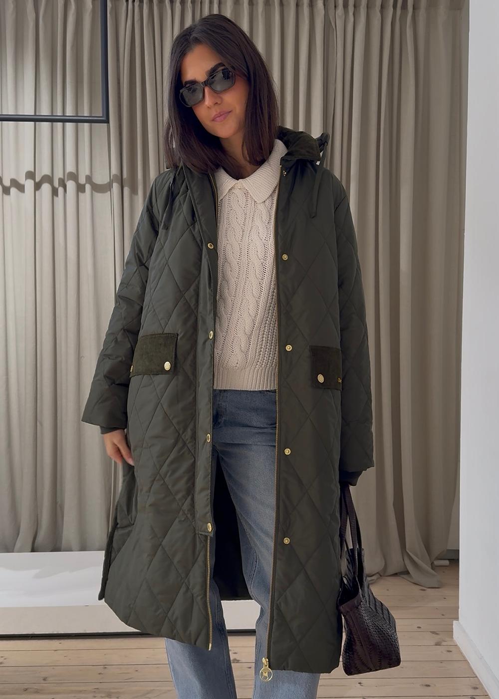 Barbour Meredith Quilted Jacket er en lang, vattert jakke i en klassisk olivengrønn farge. Den kombinerer et tidløst design med praktiske detaljer som en fast hette og et karakteristisk tartanfôr, perfekt for hverdagsbruk.