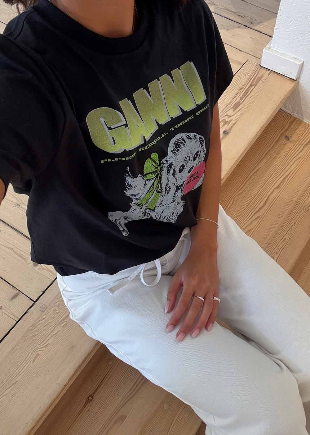 Ganni's Basic Cotton Jersey Neon Puppy T-skjorte kombinerer stil og komfort med sitt iøynefallende grafiske trykk og crew neck design. Perfekt for hverdagsbruk, laget av 100% økologisk bomull for en myk og behagelig opplevelse.