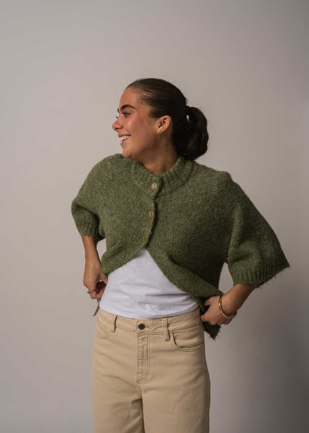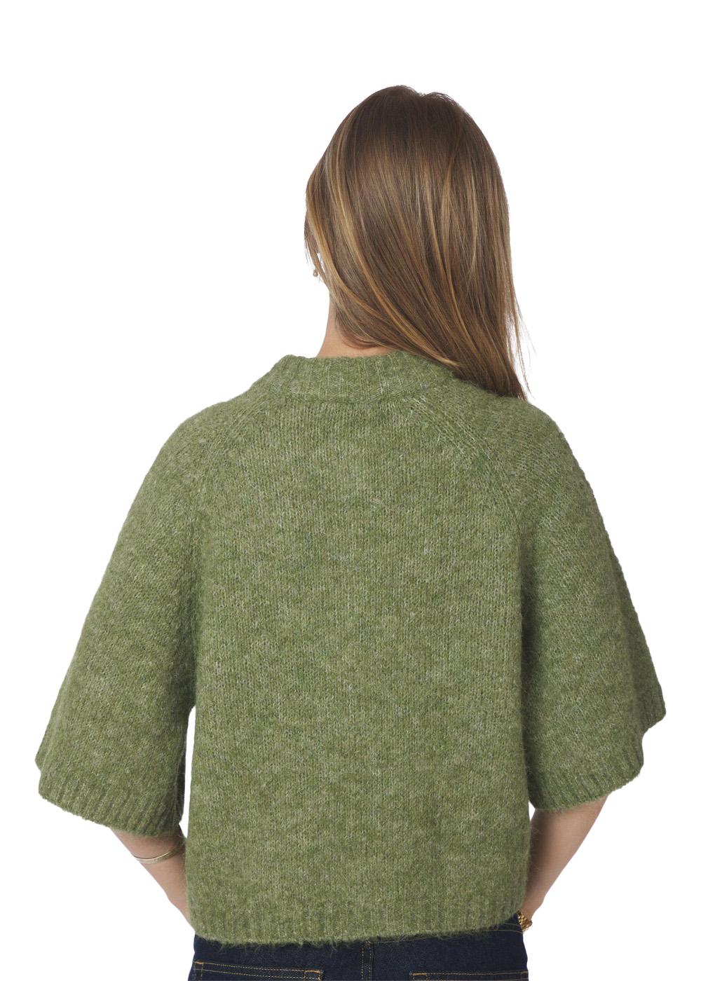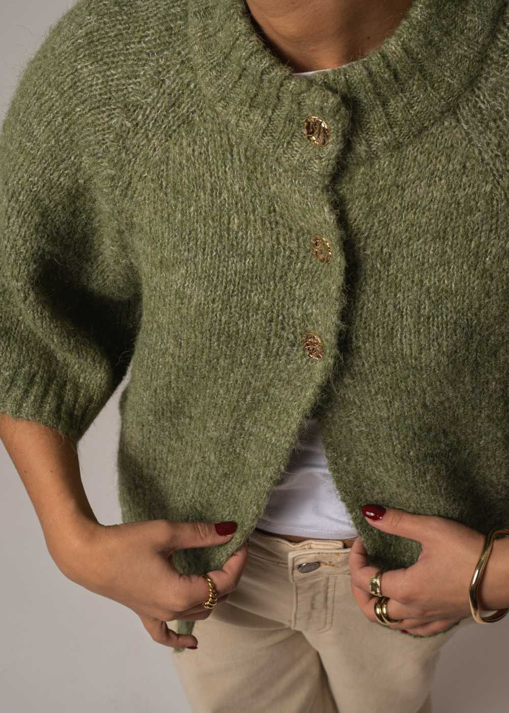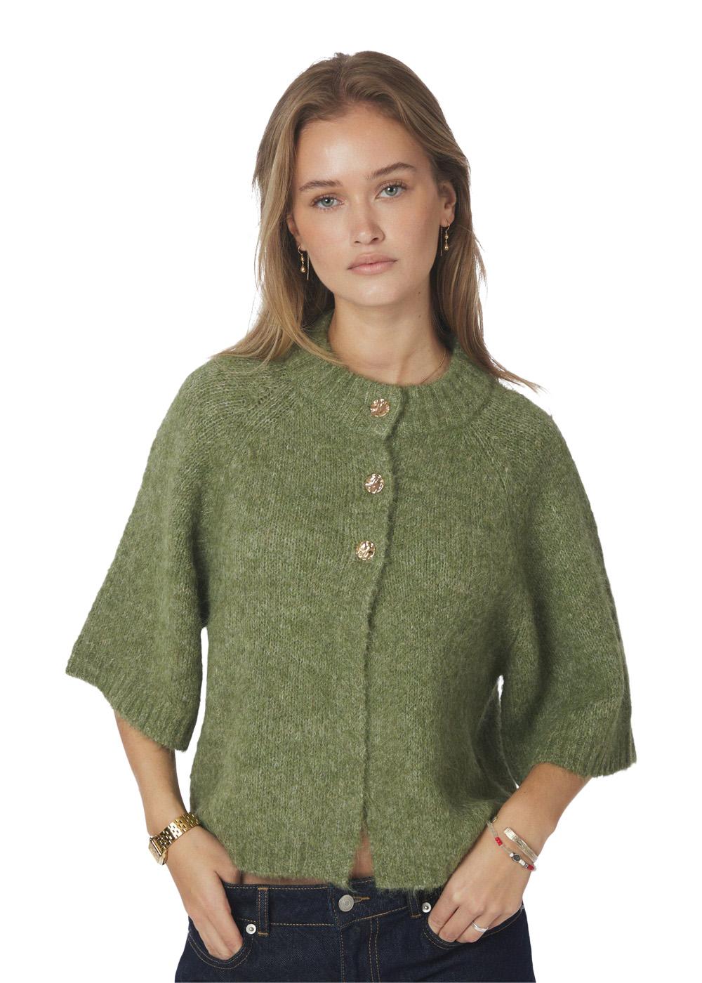 Benuta Fluffy Knit Cardigan er en sjarmerende strikkejakke i retrostil. Den kommer i en vakker, støvete grønnfarge og har et deilig, fluffy uttrykk. De vakre kontrastknappene foran fullfører det unike designet.