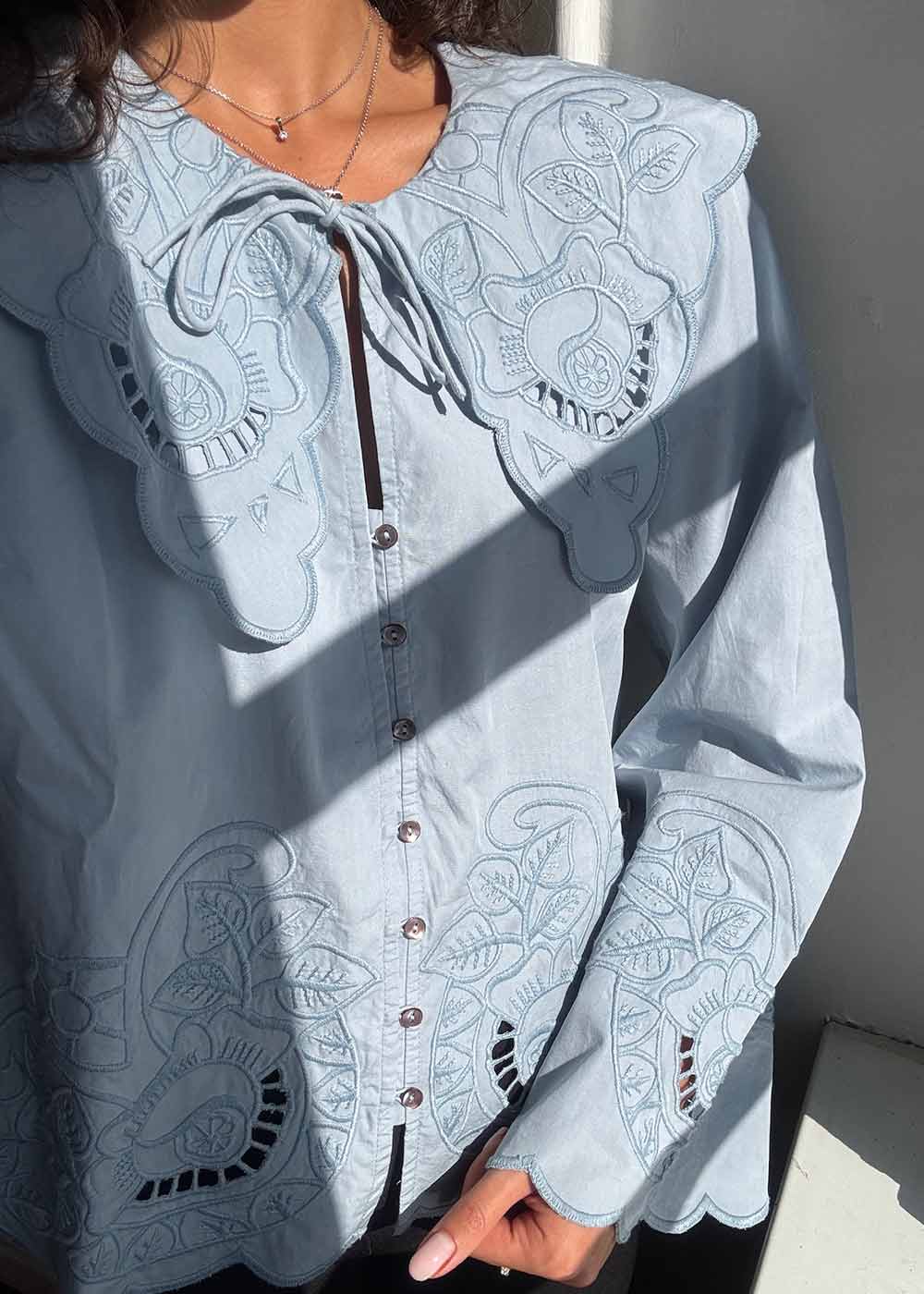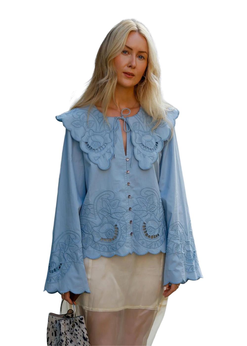Cameron Top i myk blå fra Sissel Edelbo kombinerer retro stil med moderne eleganse. De lange trompetermer og det vakre broderiet gjør den perfekt til festlige anledninger. Den boxy passformen og lukkede ryggen sikrer et stilfullt utseende.