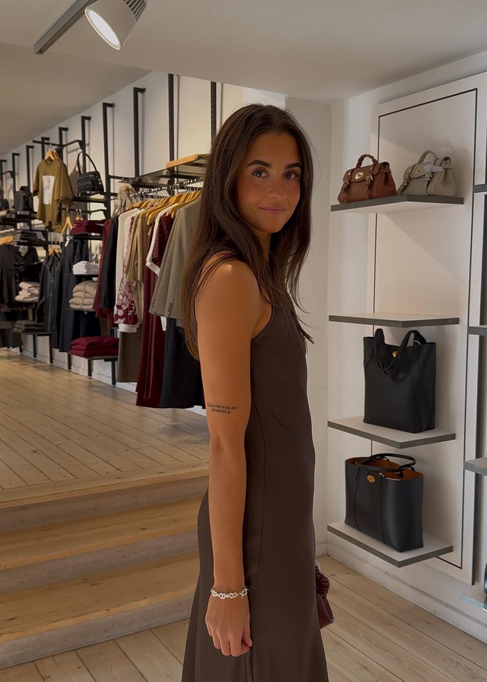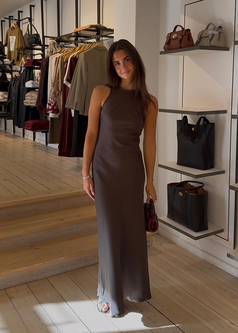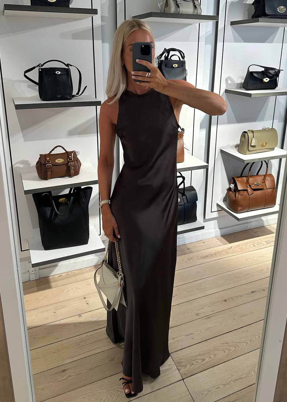 Denne kjolen kombinerer et elegant, langt snitt med en vakker satengkvalitet. Den har en regular passform og er designet uten ermer, noe som gjør den ideell for festlige anledninger.
