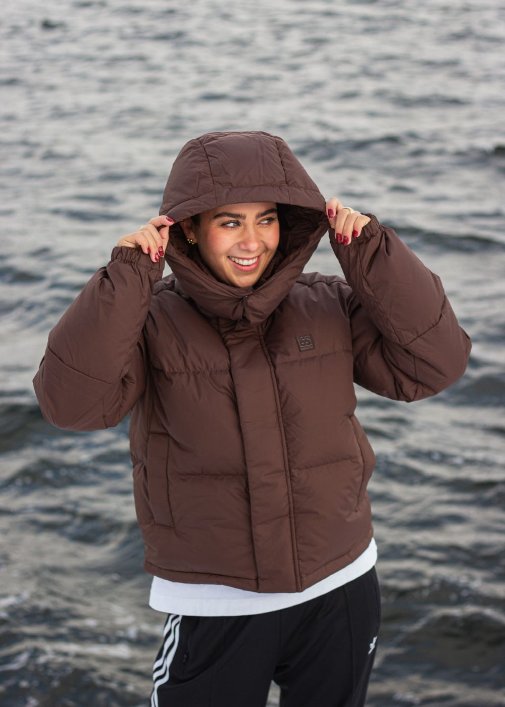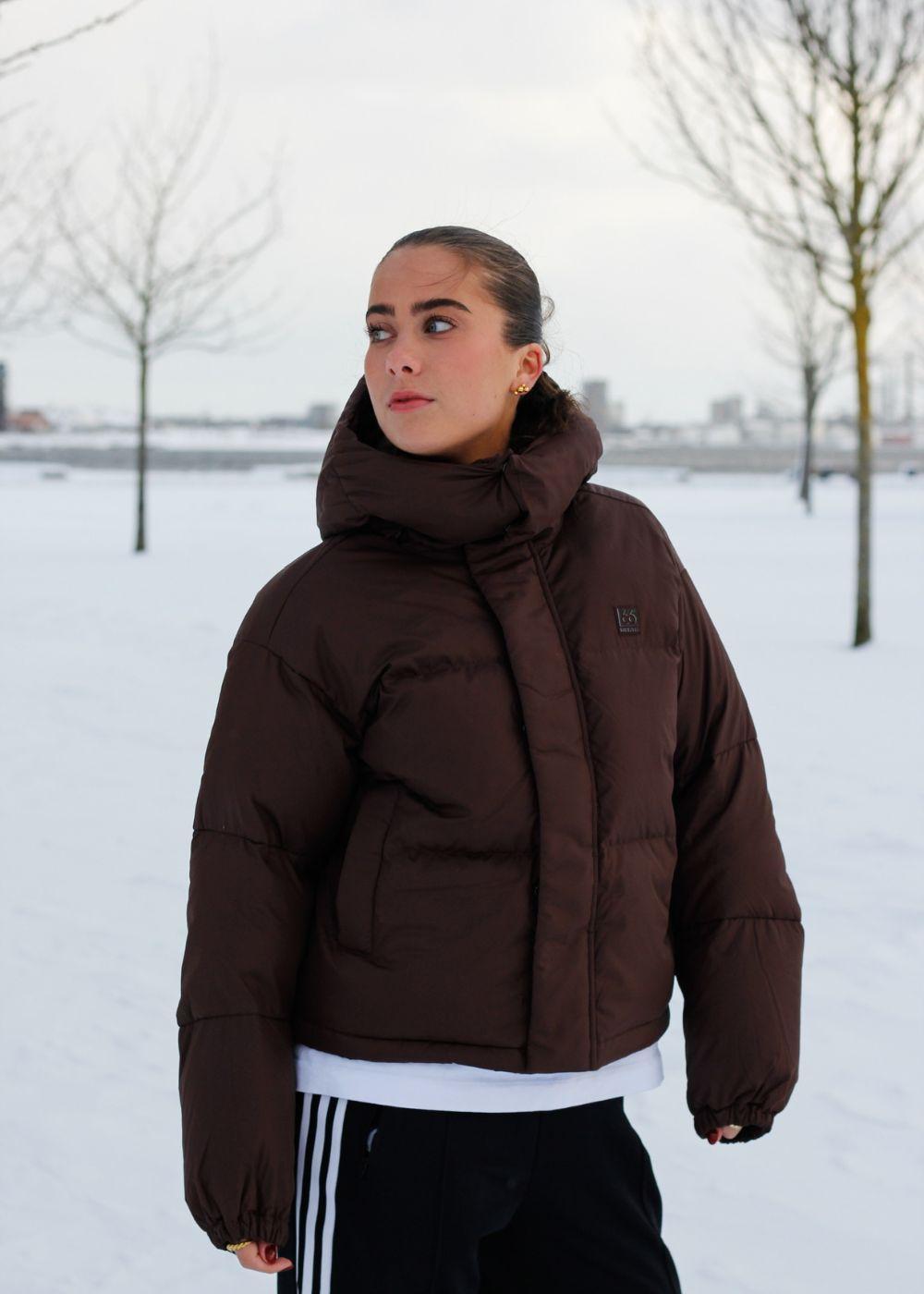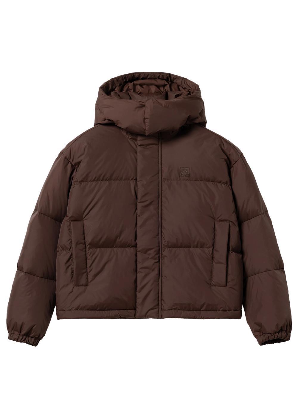 - Høy, dunfylt krage og en avtagbar hette