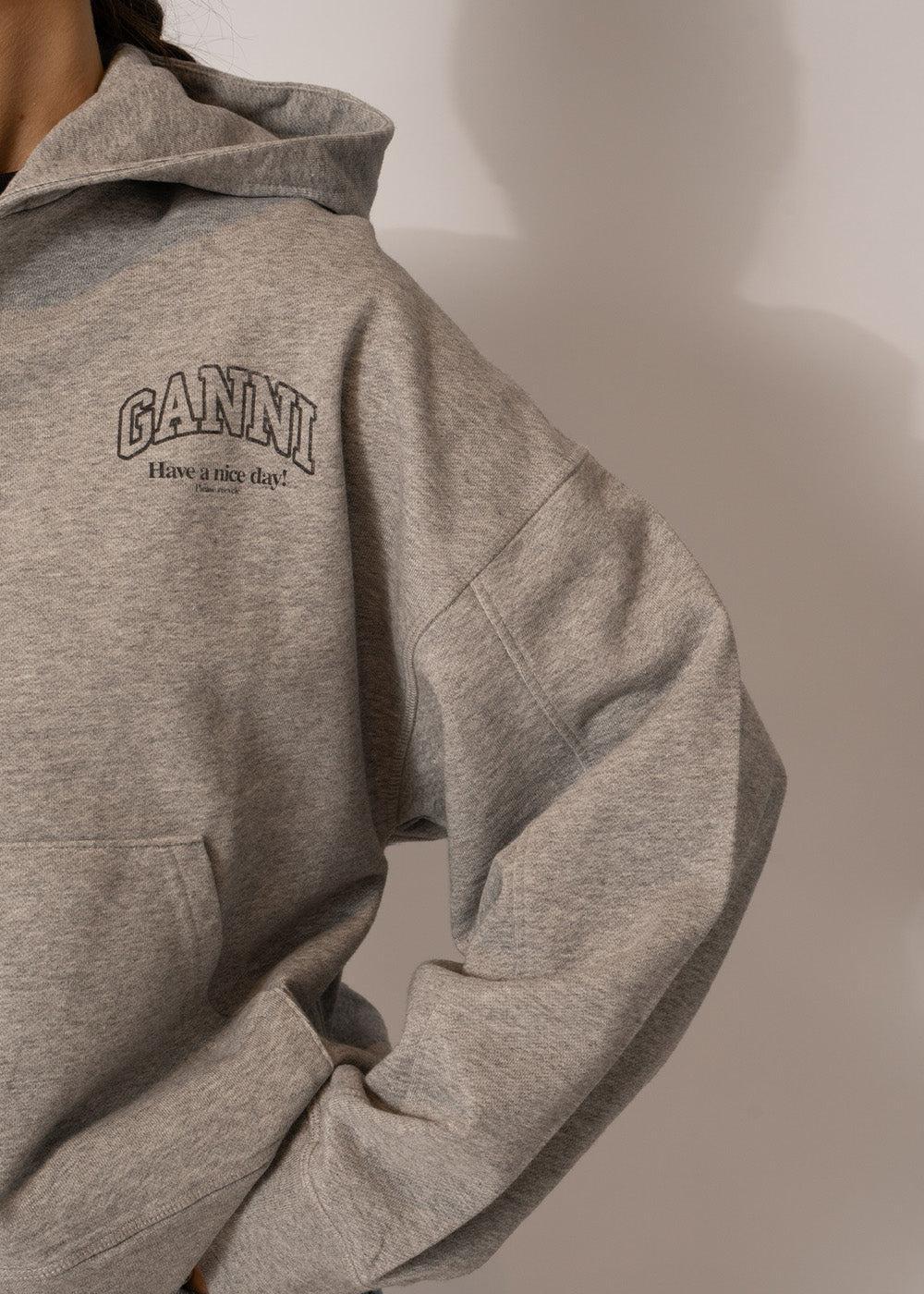 Essential Isoli Zip Hoodie fra Ganni er en grå sweatshirt med en moderne, cropped passform. Den er designet med glidelåslukking, en praktisk dobbeltlomme og en brodert logo på brystet for et avslappet uttrykk.