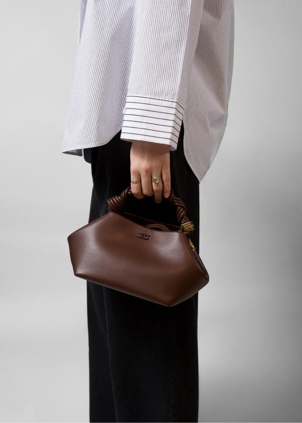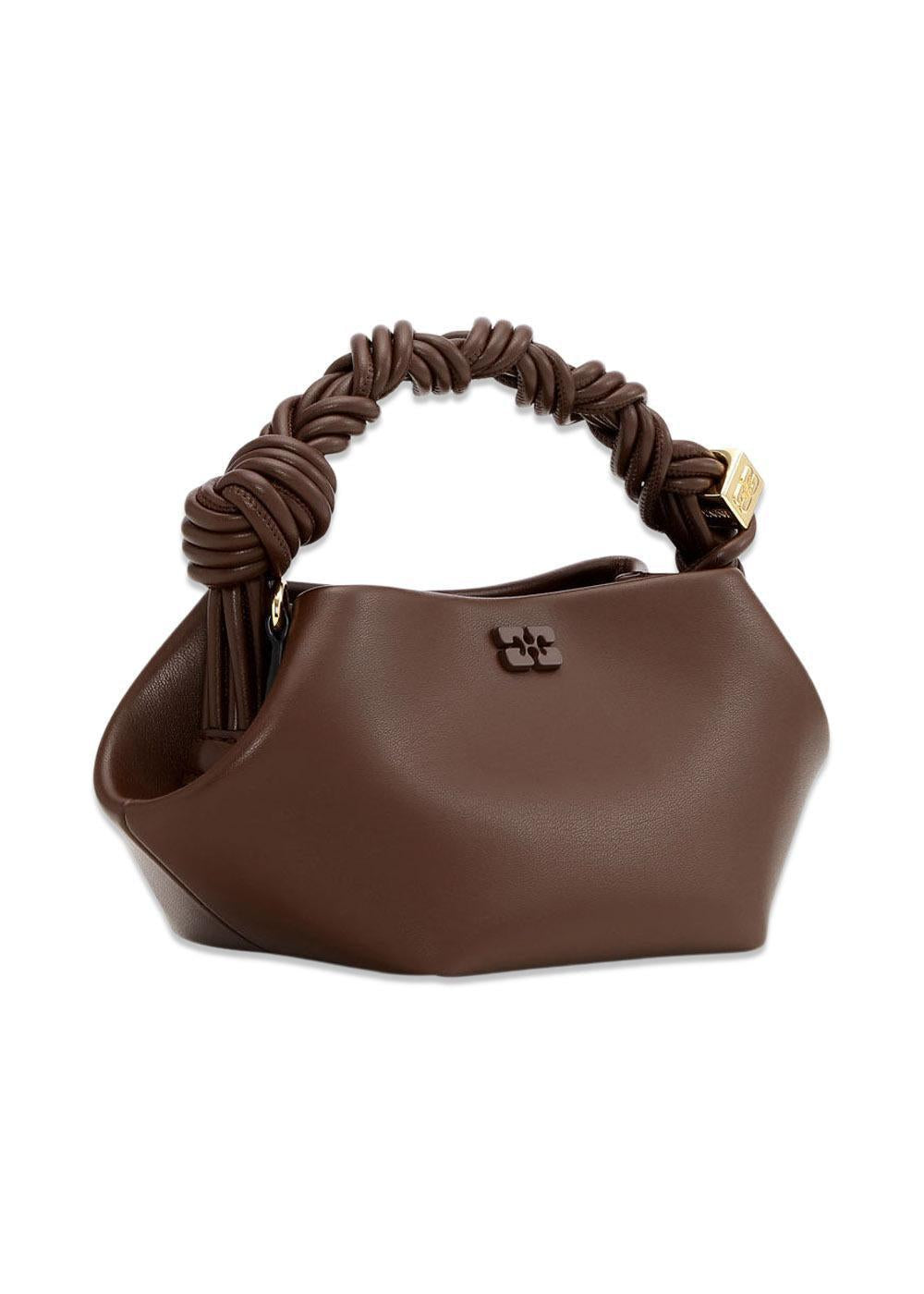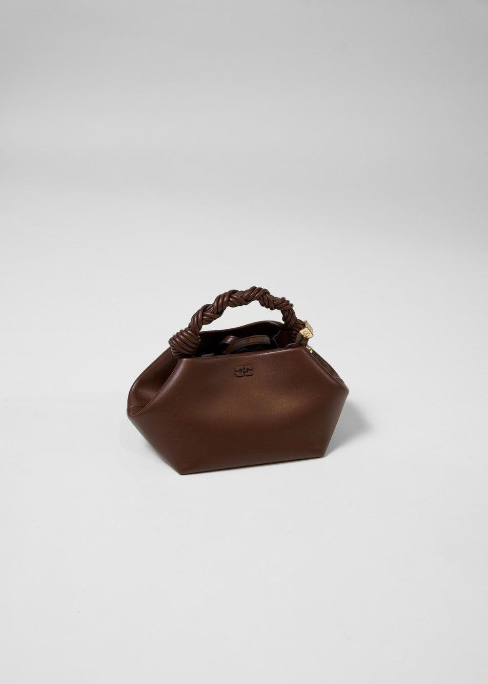 Ganni Bou Bag Mini er en stilig veske i en dyp sjokoladebrun farge. Den har en unik sekskantet form, et flettet håndtak og en diskret Ganni-logo som gir et moderne og elegant uttrykk.