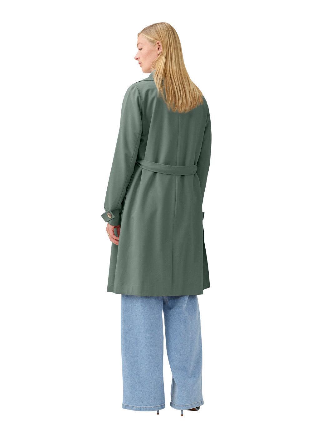 Hiro-jakken fra Modström er en klassisk trenchcoat i en elegant grønn farge. Den har et tidløst, dobbeltspent design med knappelukking og et knytebelte i midjen, som skaper en feminin silhuett.