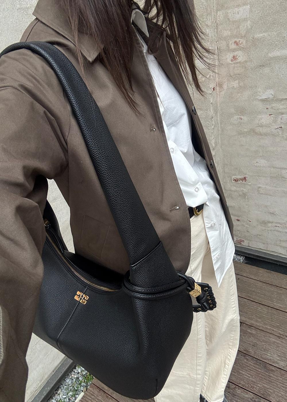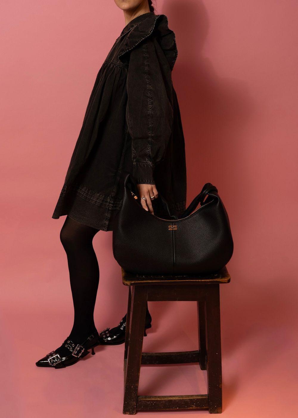 Ganni Hobo Medium Grained er en elegant skulderveske i sort. Den har en myk, buet form med en kornet overflate og er prydet med en diskret, gullfarget metalldetalj foran, som fullfører det stilige designet.