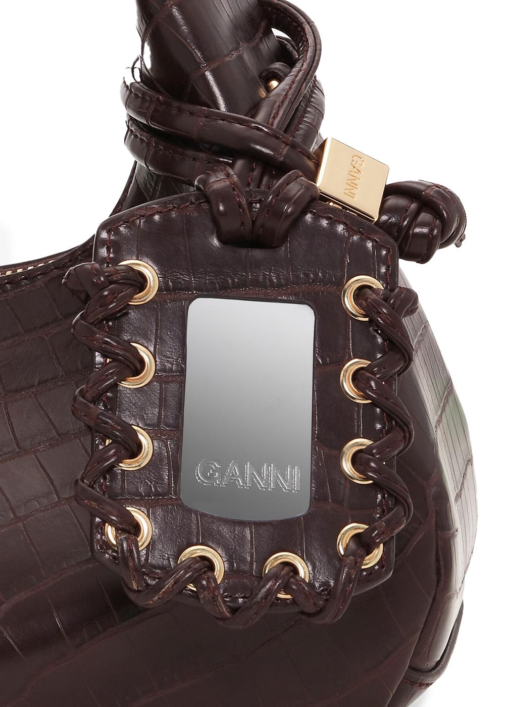 Ganni Hobo Mini Croco er en elegant veske i en dyp brun farge med krokodillepreget tekstur. Vesken har en klassisk hobo-form og er utsmykket med en diskret Ganni-logo og flettede detaljer på hanken.