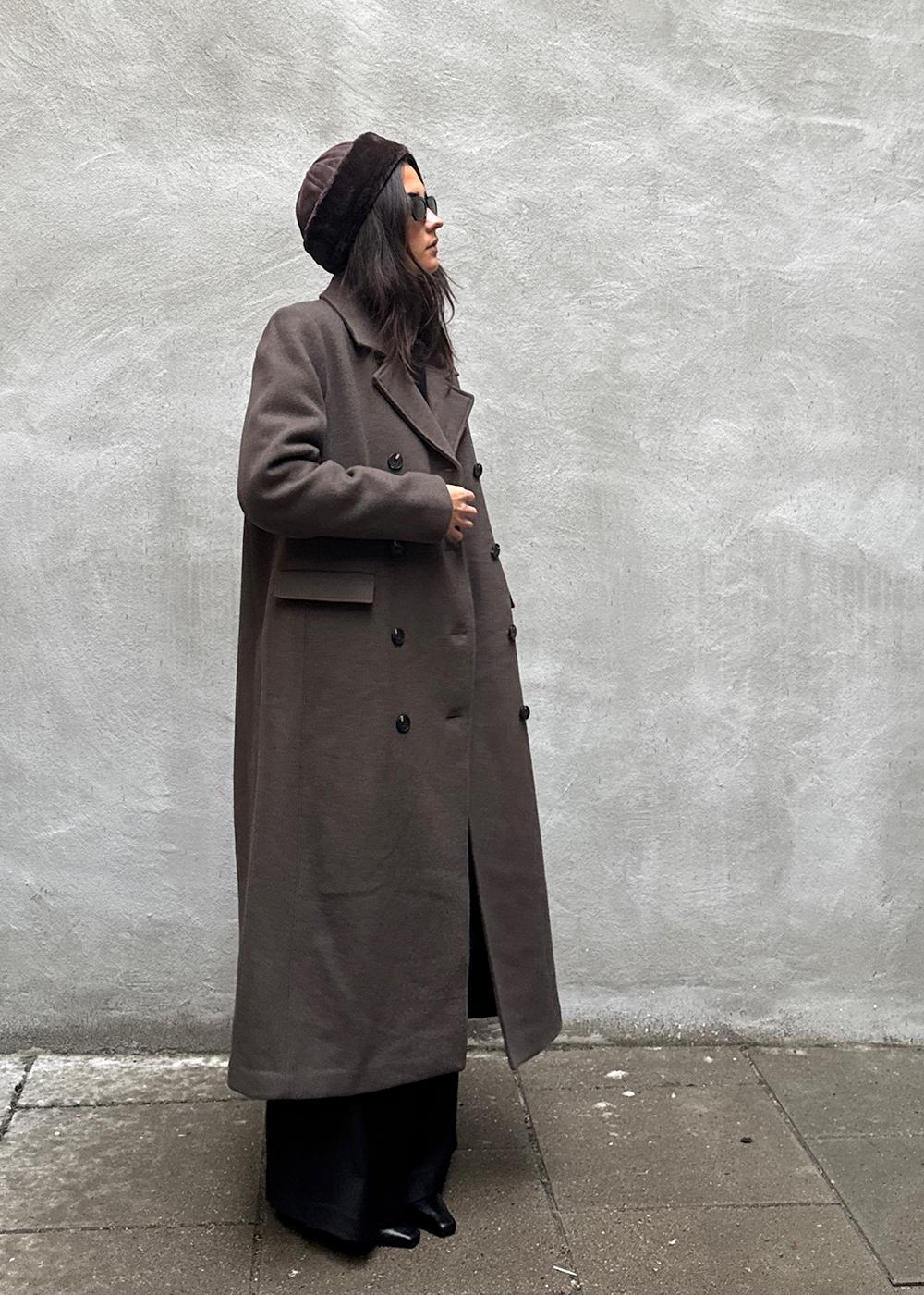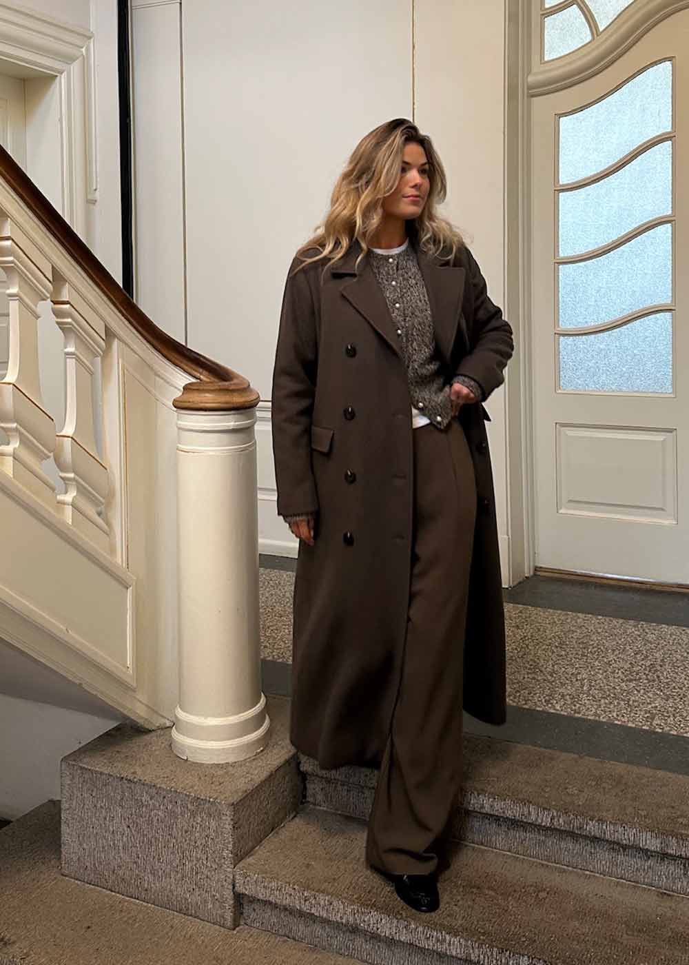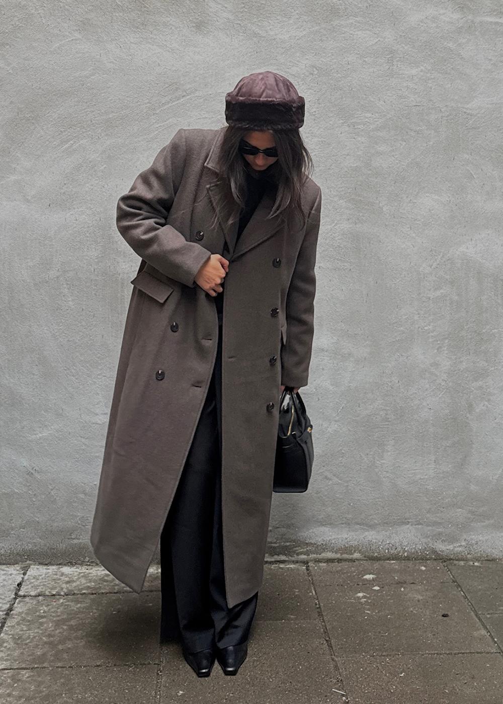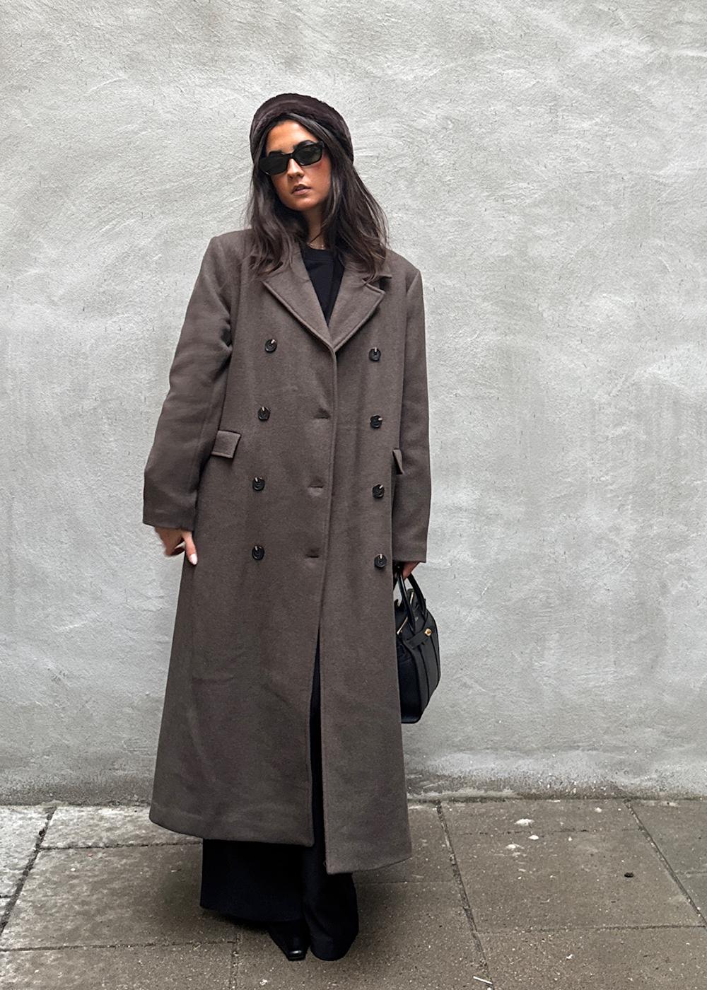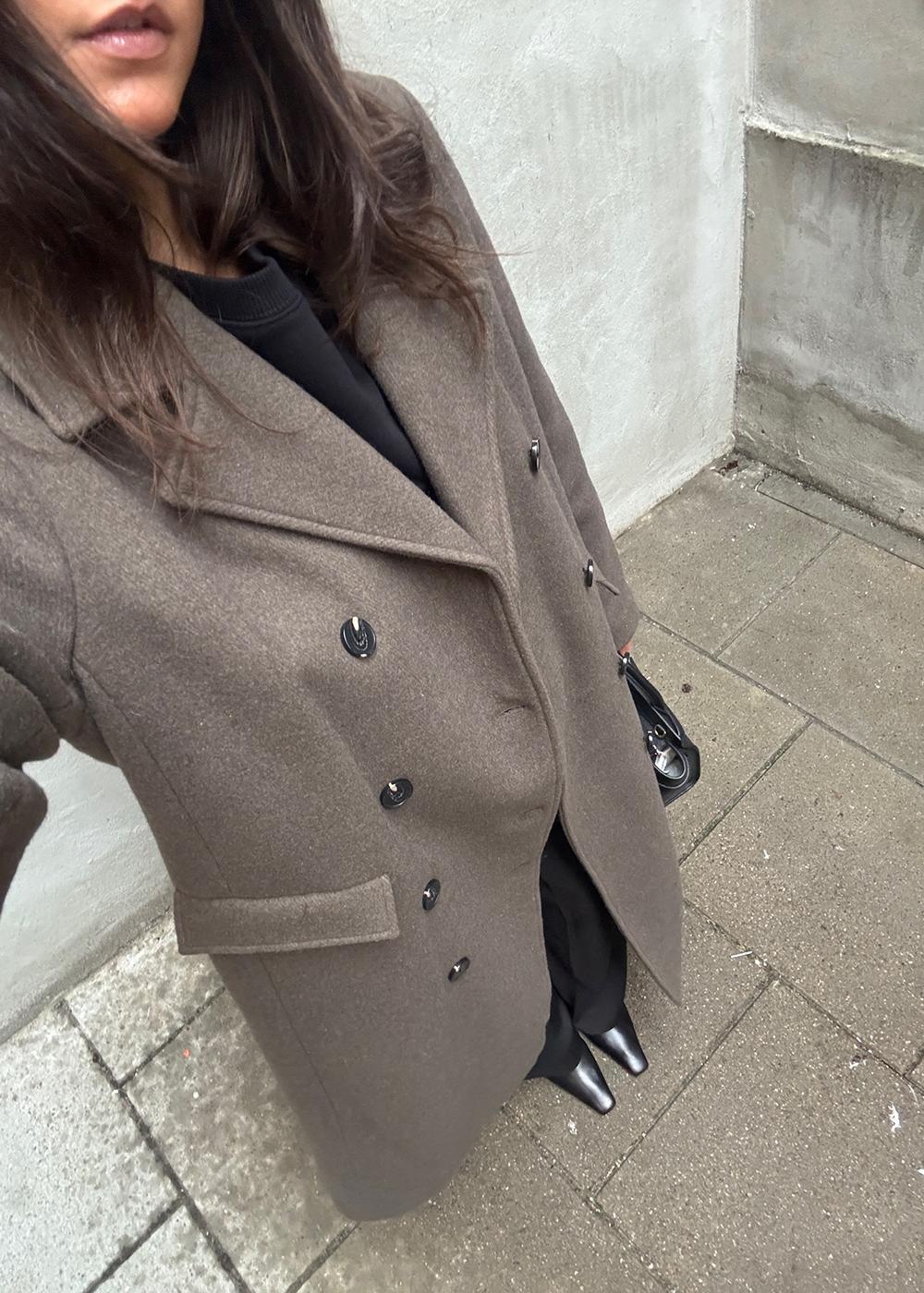 Denne kåpen kombinerer et formelt uttrykk med en avslappet passform. Den varme ullblandingen og de klassiske detaljene gjør den til et allsidig valg for både hverdag og festlige anledninger.