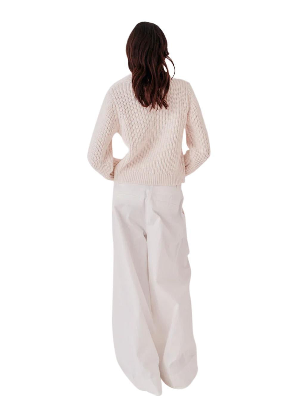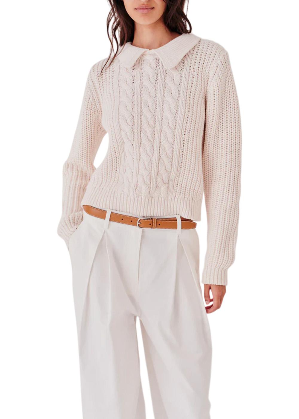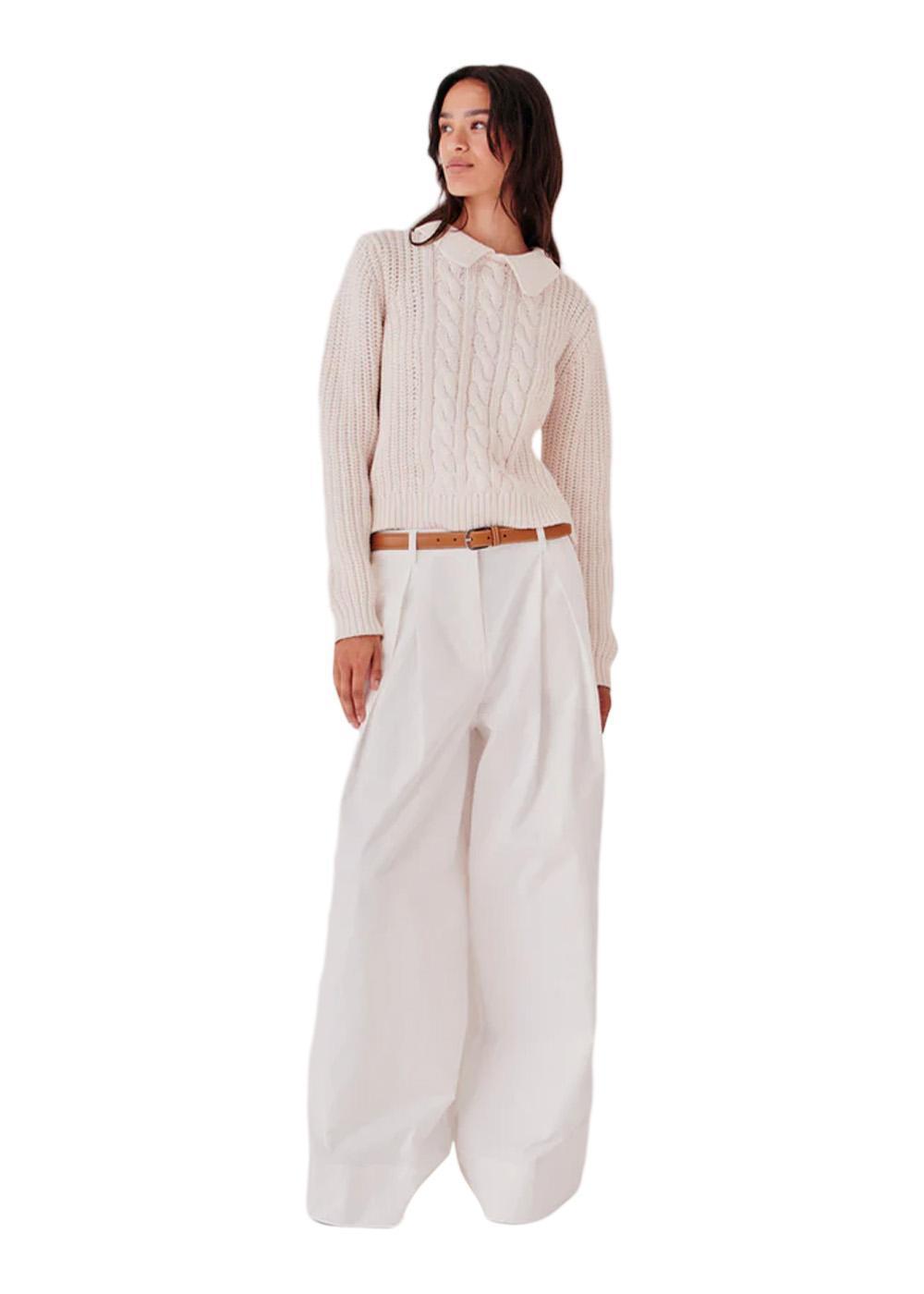 Leone Mini Polo er en klassisk kabelstrikket genser i en vakker kremfarge. Den har en elegant polokrage og en moderne, cropped passform som gir et tidløst og stilig uttrykk til garderoben din.