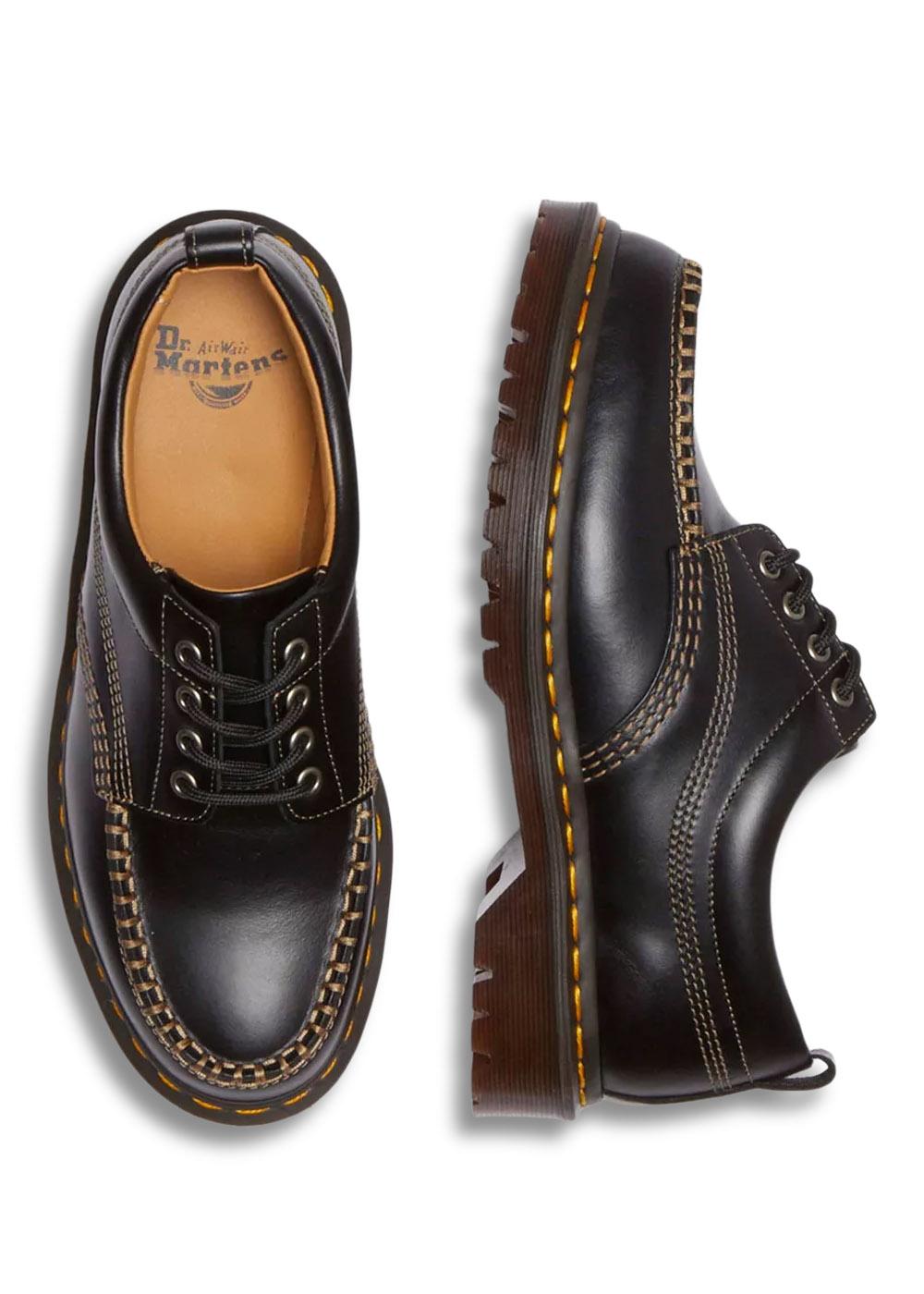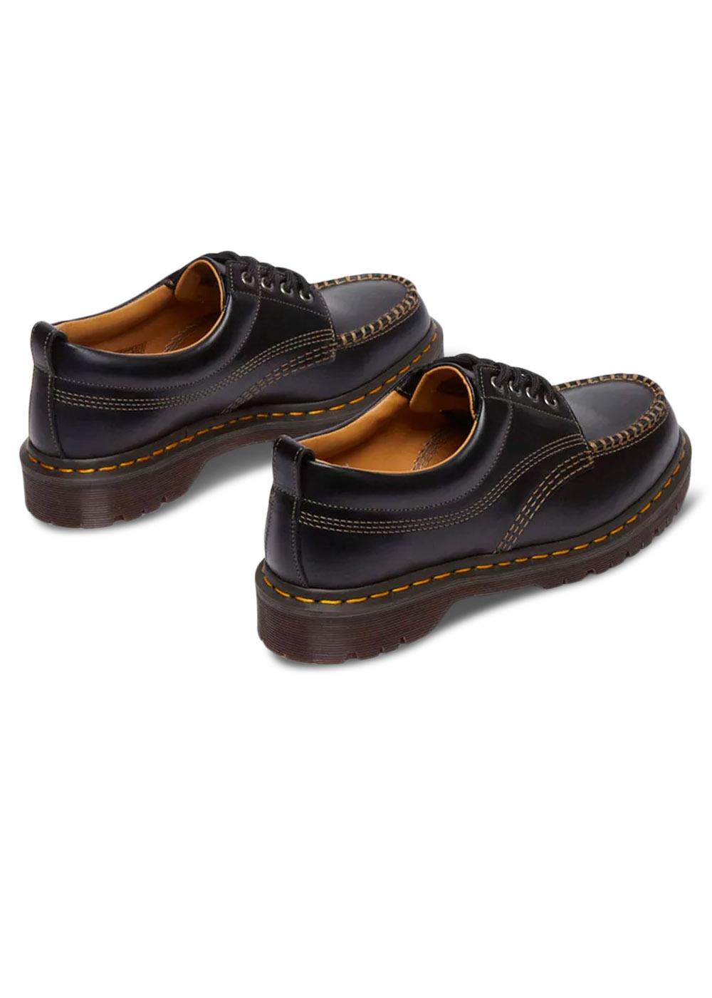 Disse Dr. Martens-skoene i sort er en klassisk modell med et robust uttrykk. De har en markant firkantet tupp og er fremhevet med kontrastsømmer som gir et unikt og gjenkjennelig design.