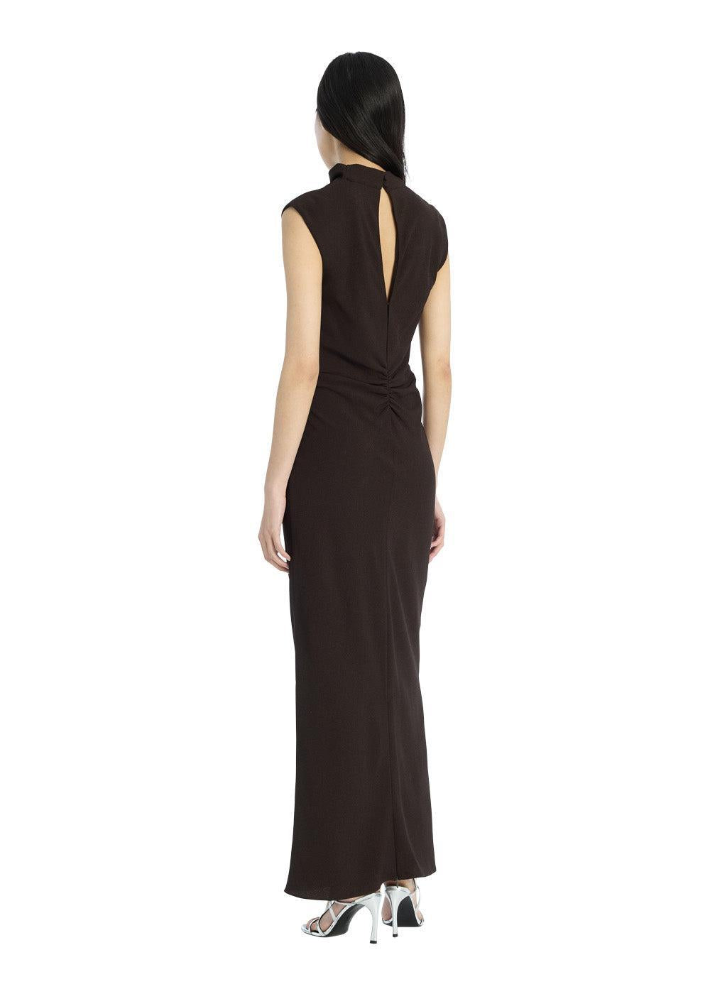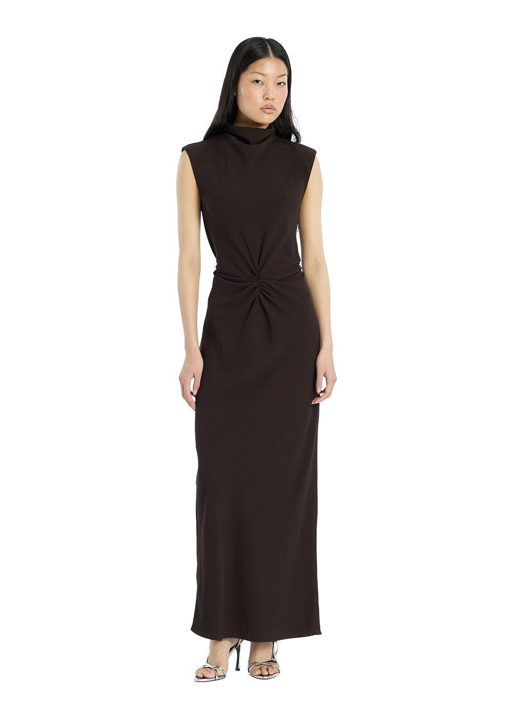 Elegant midikjole fra Rotate i en dyp, ensfarget brun. Kjolen har en slank passform med høy hals og vakre rynkedetaljer i midjen, som skaper en flatterende silhuett til formelle anledninger.
