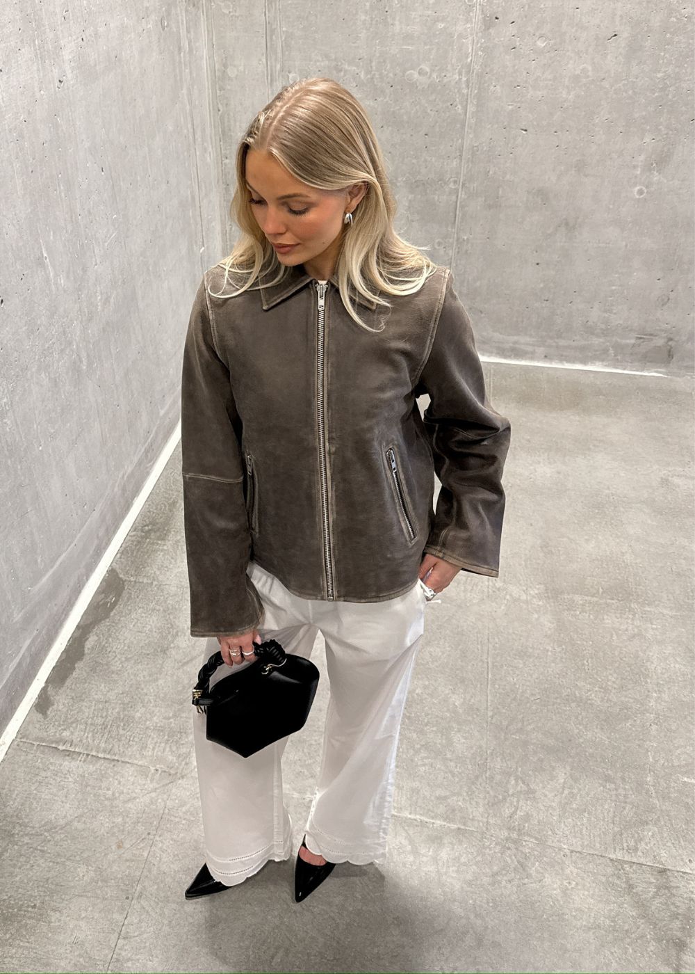 Denne jakken kombinerer et retro-design med en moderne, boxy passform. Den korte modellen med skjortekrage og glidelåsdetaljer er enkel å style til både hverdag og fest, noe som gjør den til en allsidig favoritt.