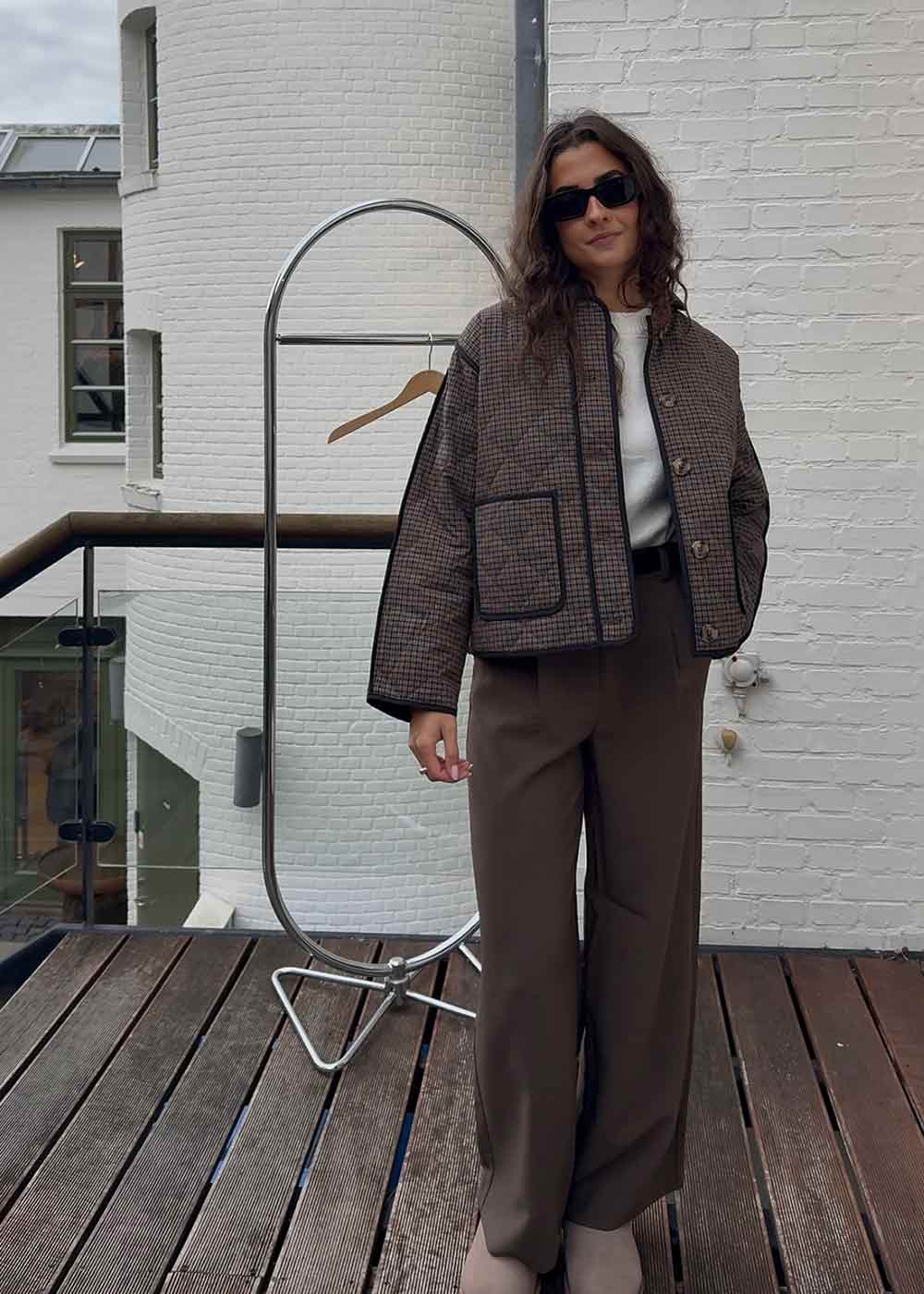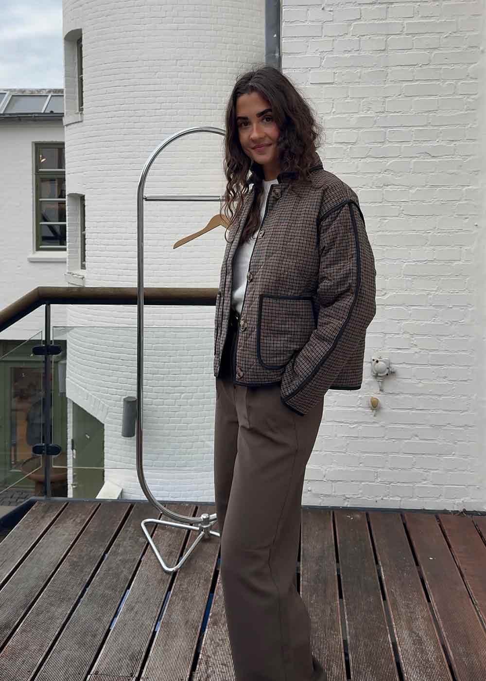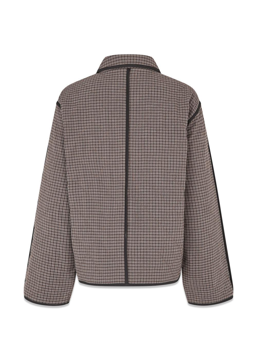 Denne rutete jakken kombinerer et retro-inspirert design med en boxy silhuett. Den er ideell til hverdagsbruk og tilfører et stilig preg til ethvert antrekk, enten det er over en kjole eller jeans.