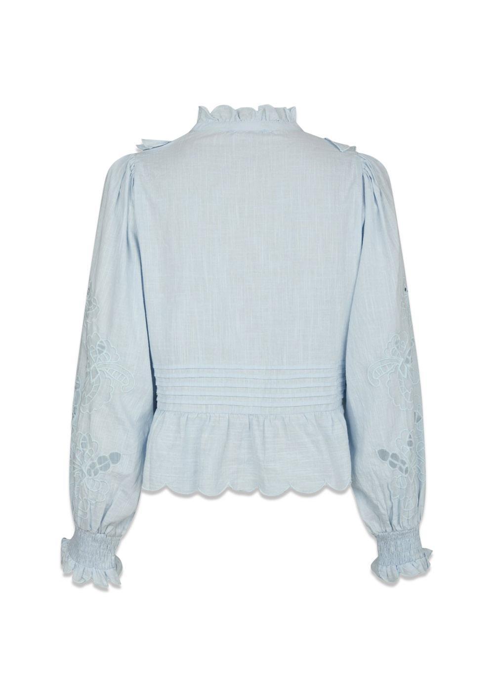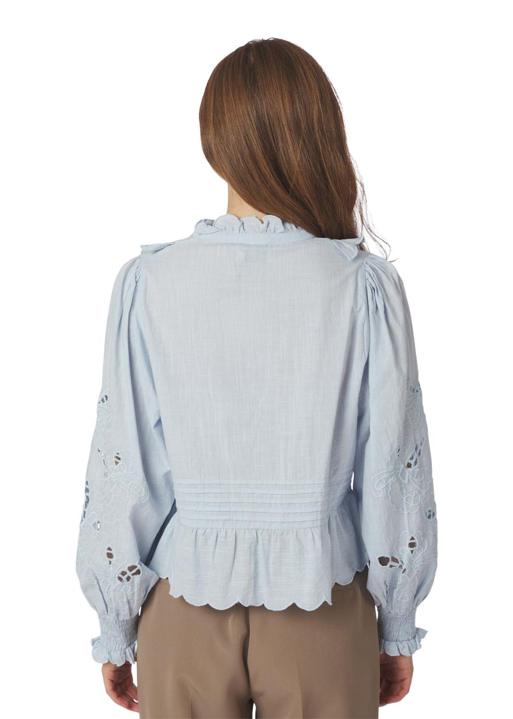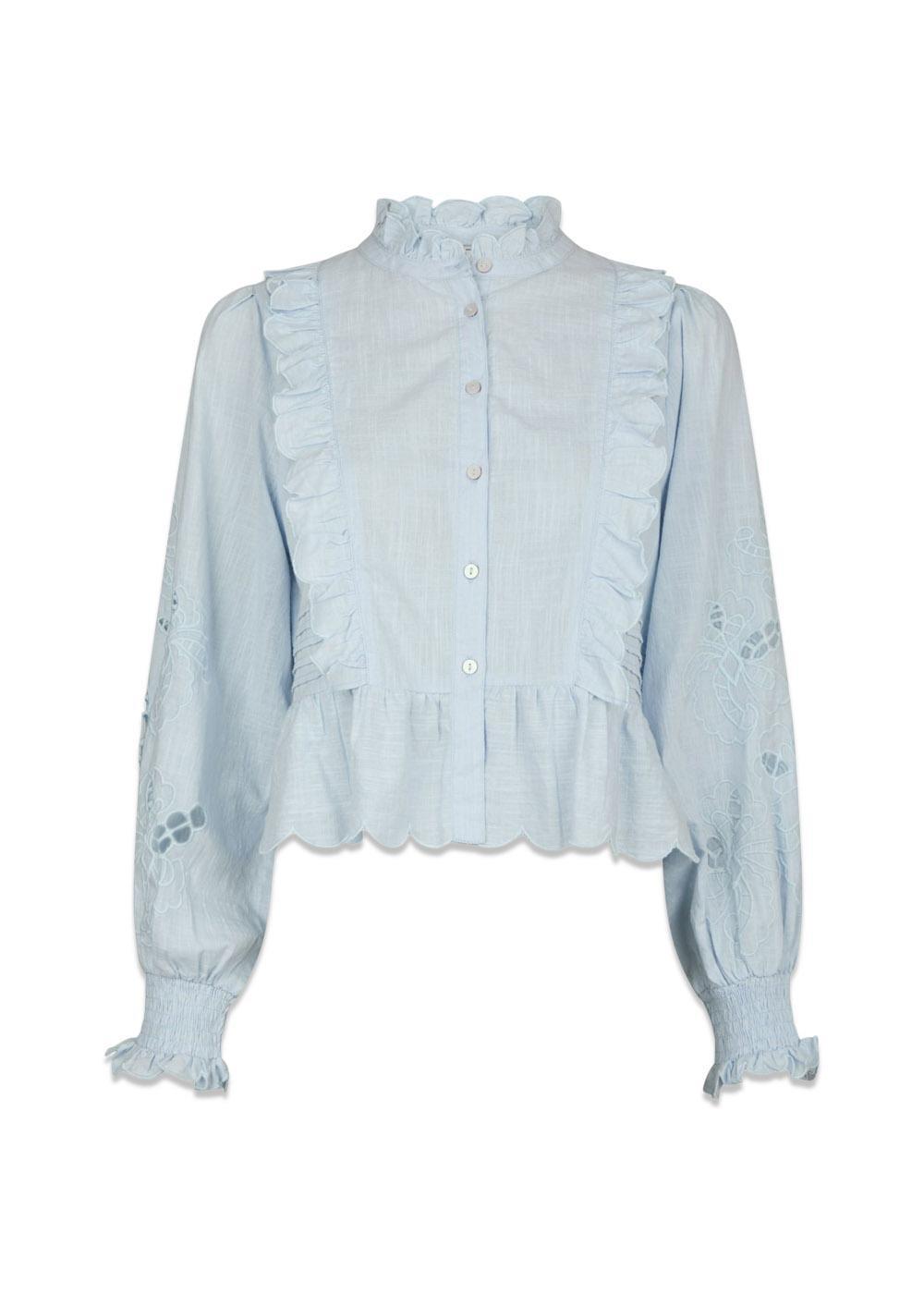 Petrine Embroidery Blouse fra Neo Noir er en klassisk bomullsbluse i en fin lyseblå farge. Den er designet med feminine broderidetaljer som gir et elegant og tidløst uttrykk til garderoben din.