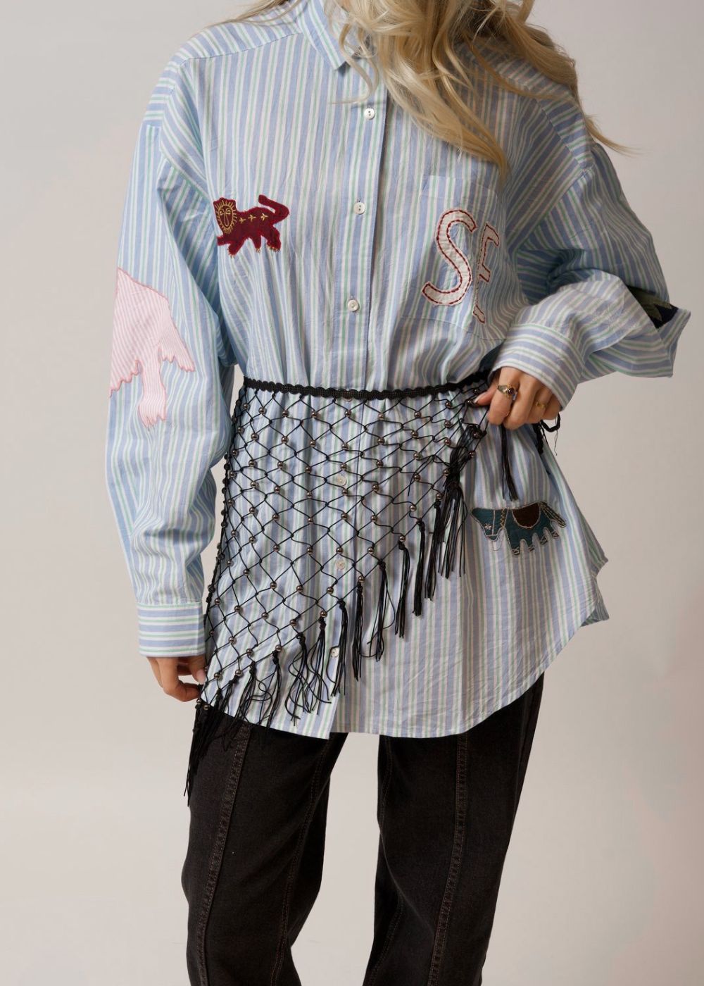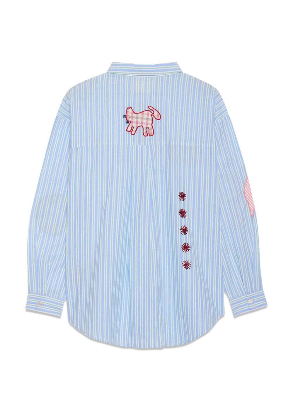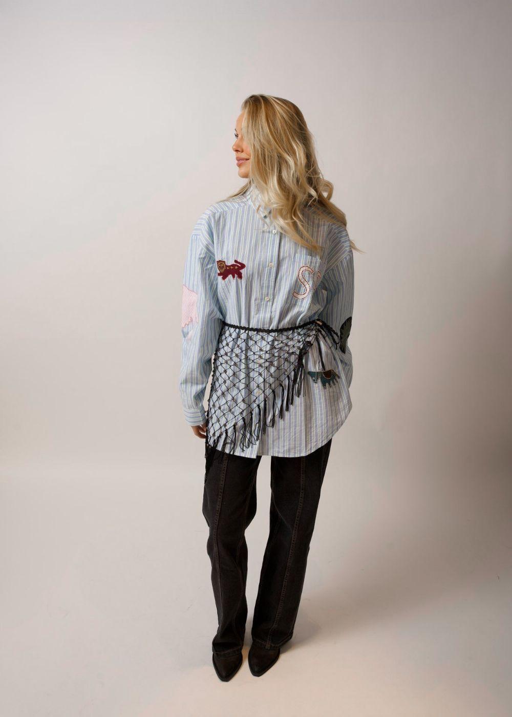 Pil Shirt er en stripete skjorte i retrostil i blå og grønne nyanser. Den har et lekent uttrykk med unike detaljer som patchwork, broderi og en praktisk brystlomme for et personlig preg.