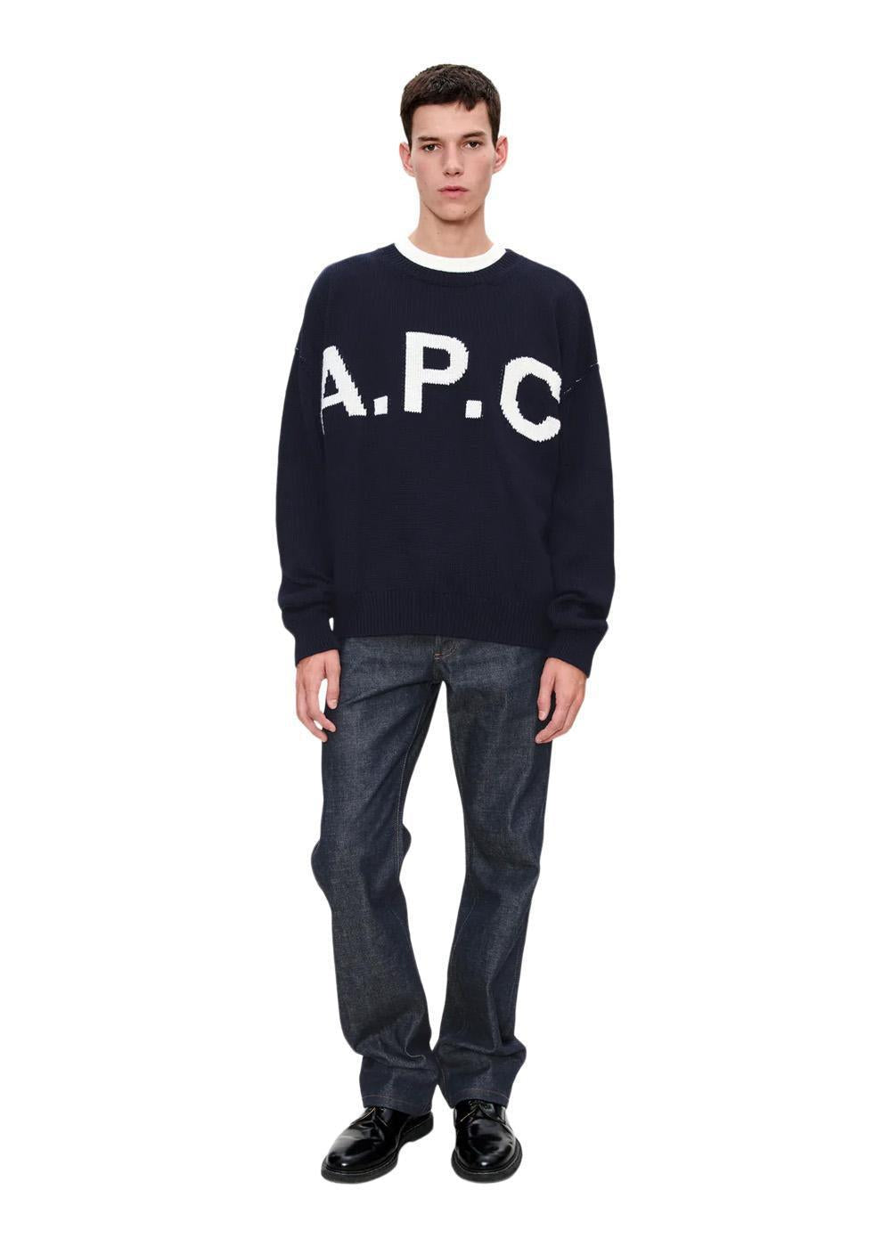 Denne klassiske strikkegenseren fra A.P.C. er laget i en dyp mørkeblå farge. Den har en markant, jacquard-strikket logo på brystet, som gir et tidløst og gjenkjennelig uttrykk til din hverdagsgarderobe.
