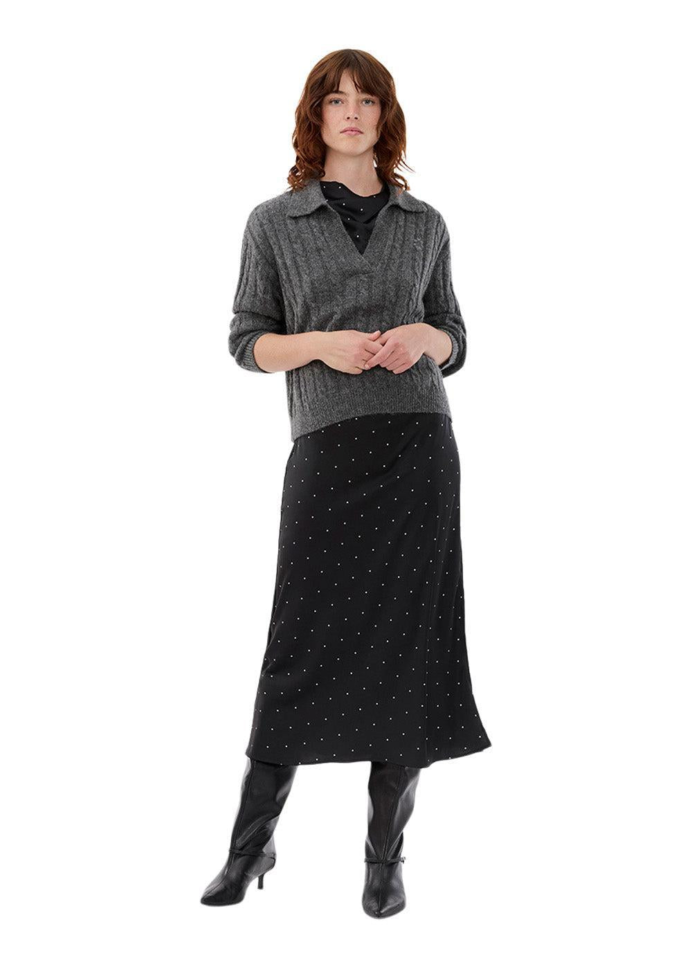 Oppdag denne klassiske kabelstrikkede poloen fra Modström i en mørkegrå melange. Med sin elegante V-hals, polokrage og cropped passform kombinerer den tidløs stil med et moderne og avslappet uttrykk.