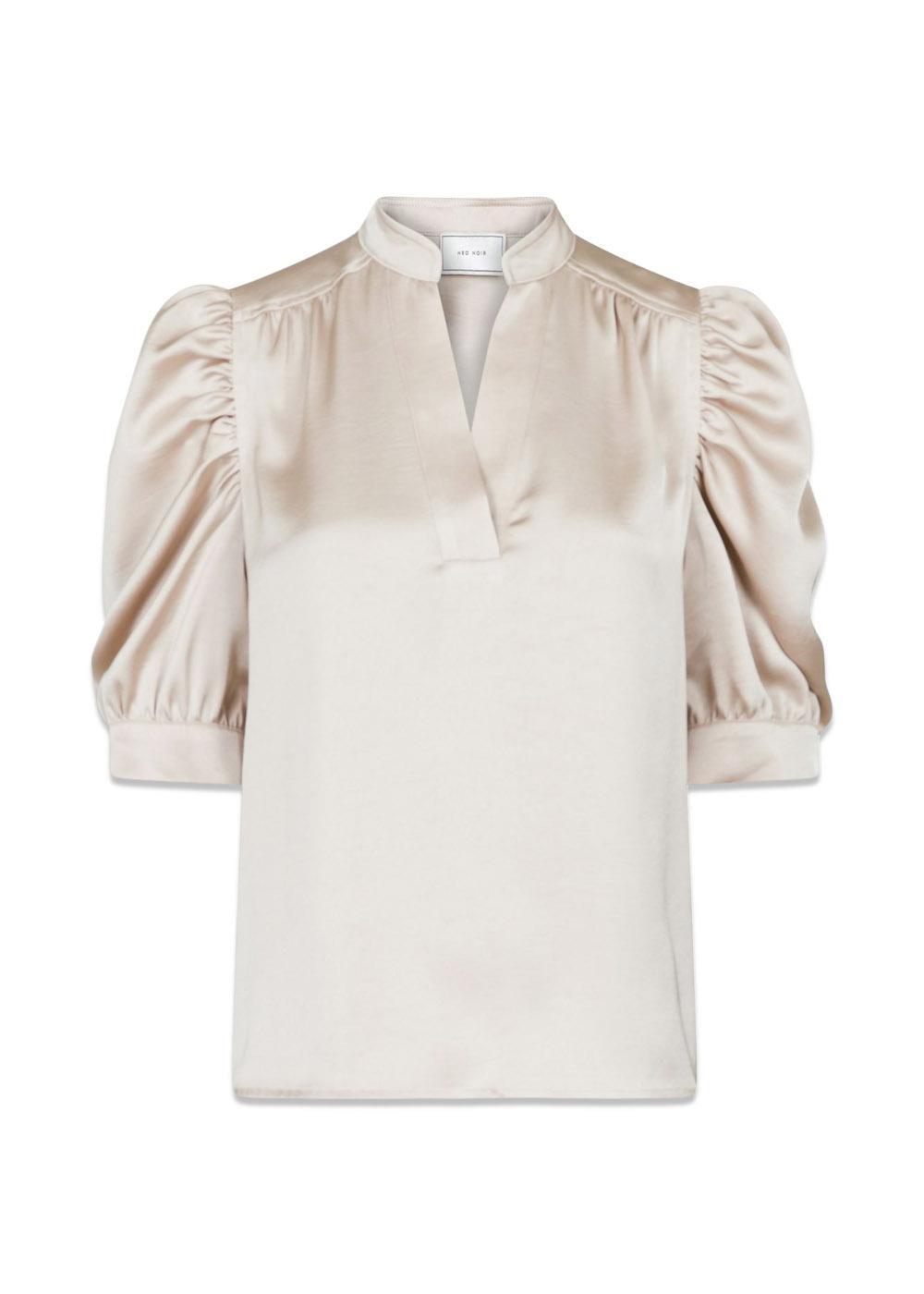 Roella Heavy Sateen Blouse fra Neo Noir er en feminin bluse i en elegant champagnefarge. Den er laget i en myk satengkvalitet med draperte ermer, dekorative stikninger og en åpning foran.