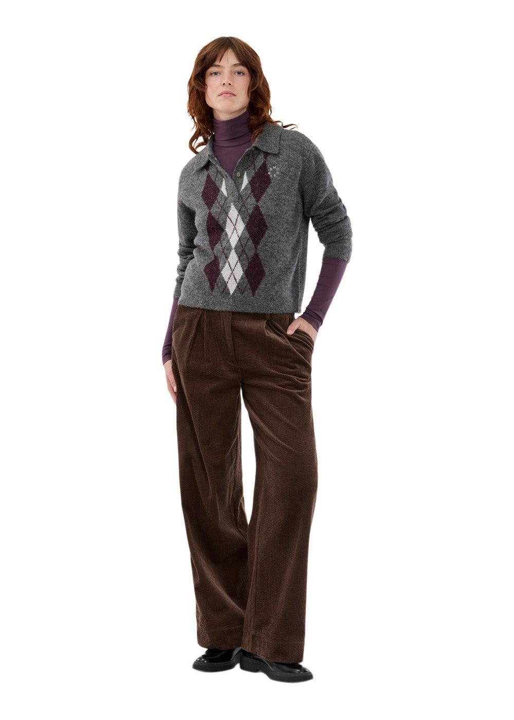 - Mønster: Iøynefallende jacquard-strikkede diamantruter på forsiden.