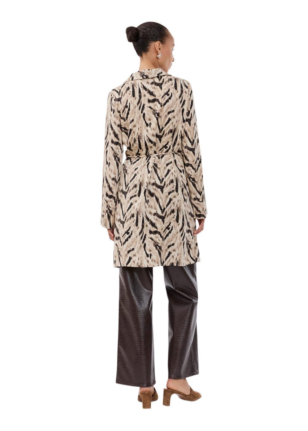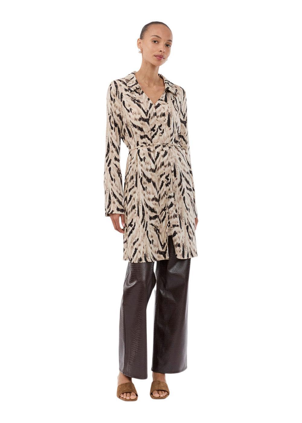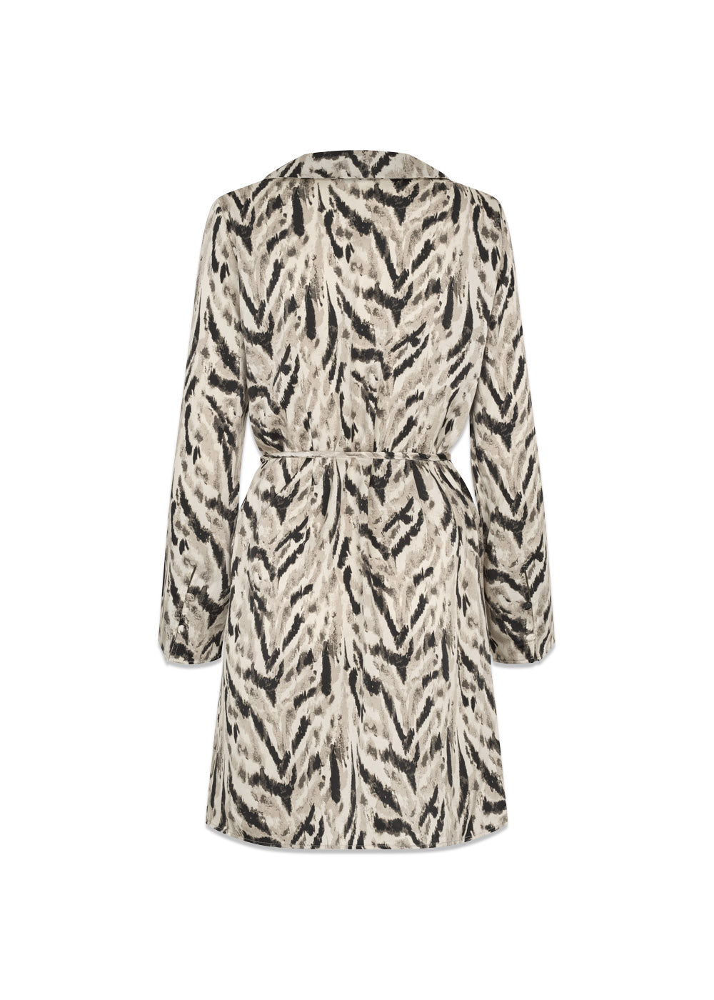 Sabellemd-printkjolen fra Modström er en minikjole med et iøynefallende dyreprint. Den har V-hals, lange ermer og et belte i midjen som skaper en feminin silhuett med et retro-inspirert uttrykk.