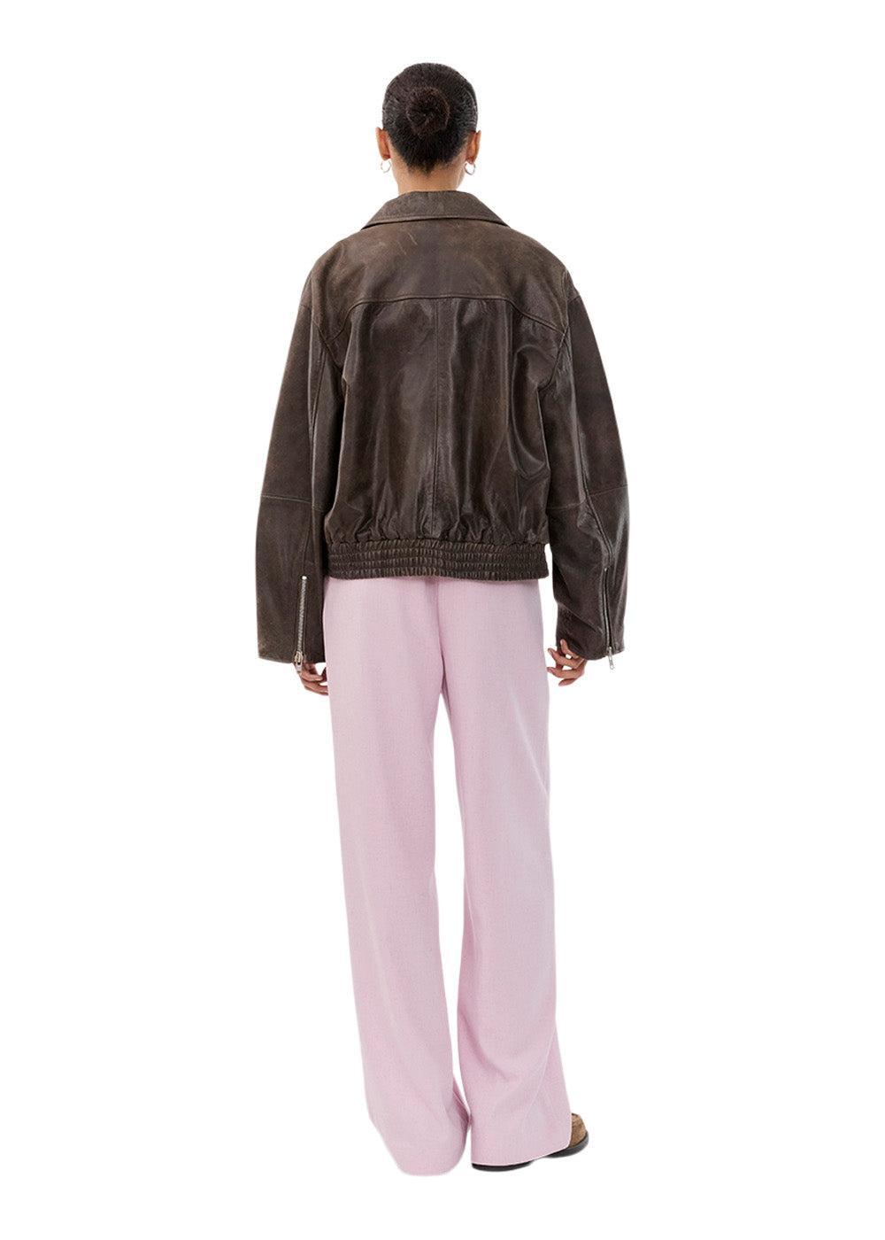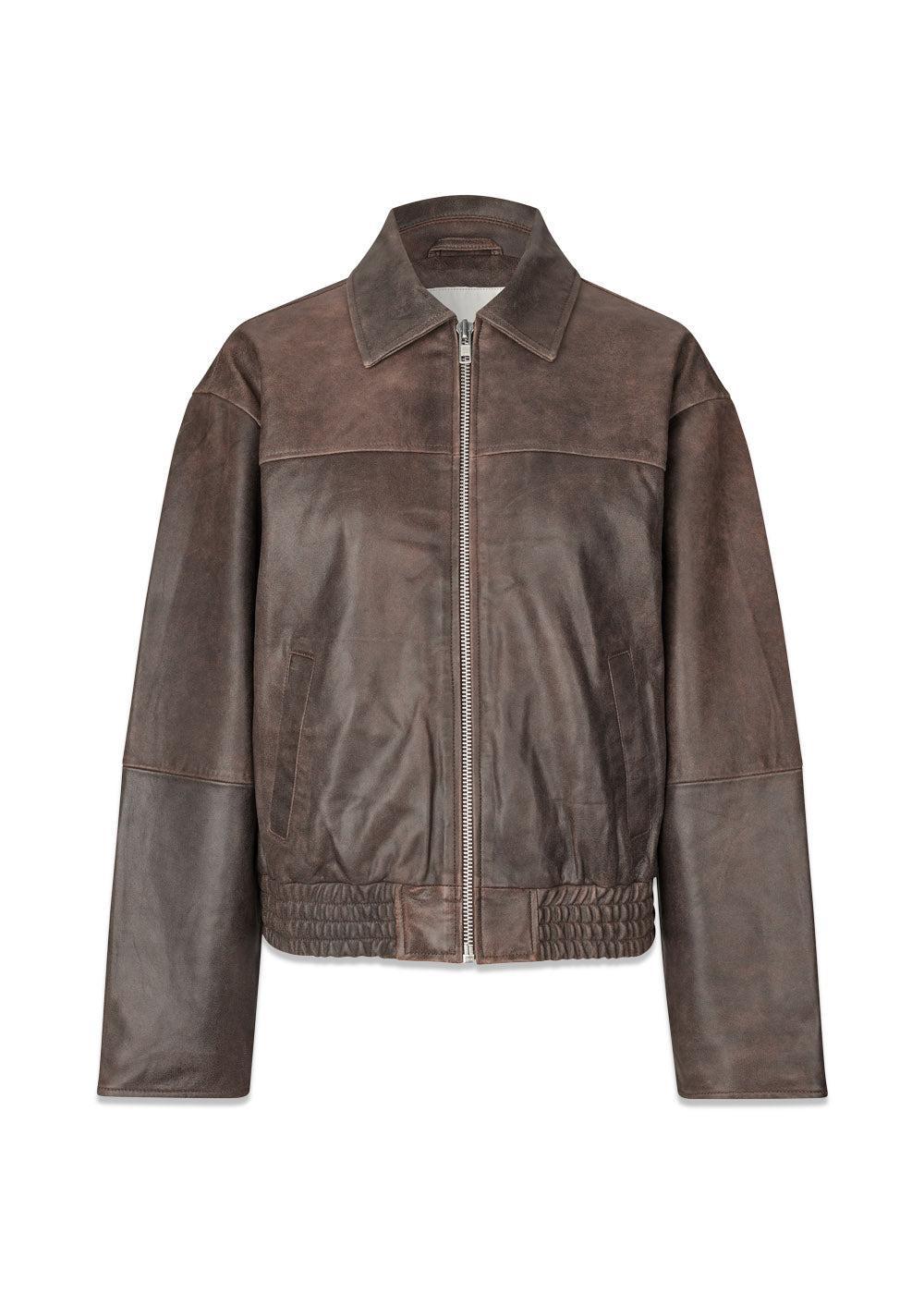 Salmonmd-jakken fra Modström er en kort skinnjakke i en flott, dyp brunfarge. Jakken har et retroinspirert design med en boxy passform, glidelåslukking og en klassisk krage som fullfører det røffe utseendet.