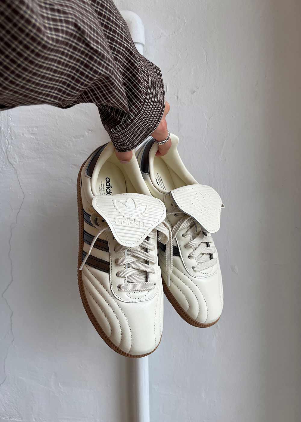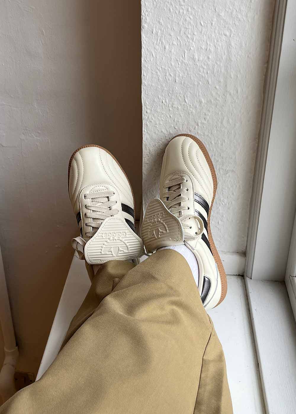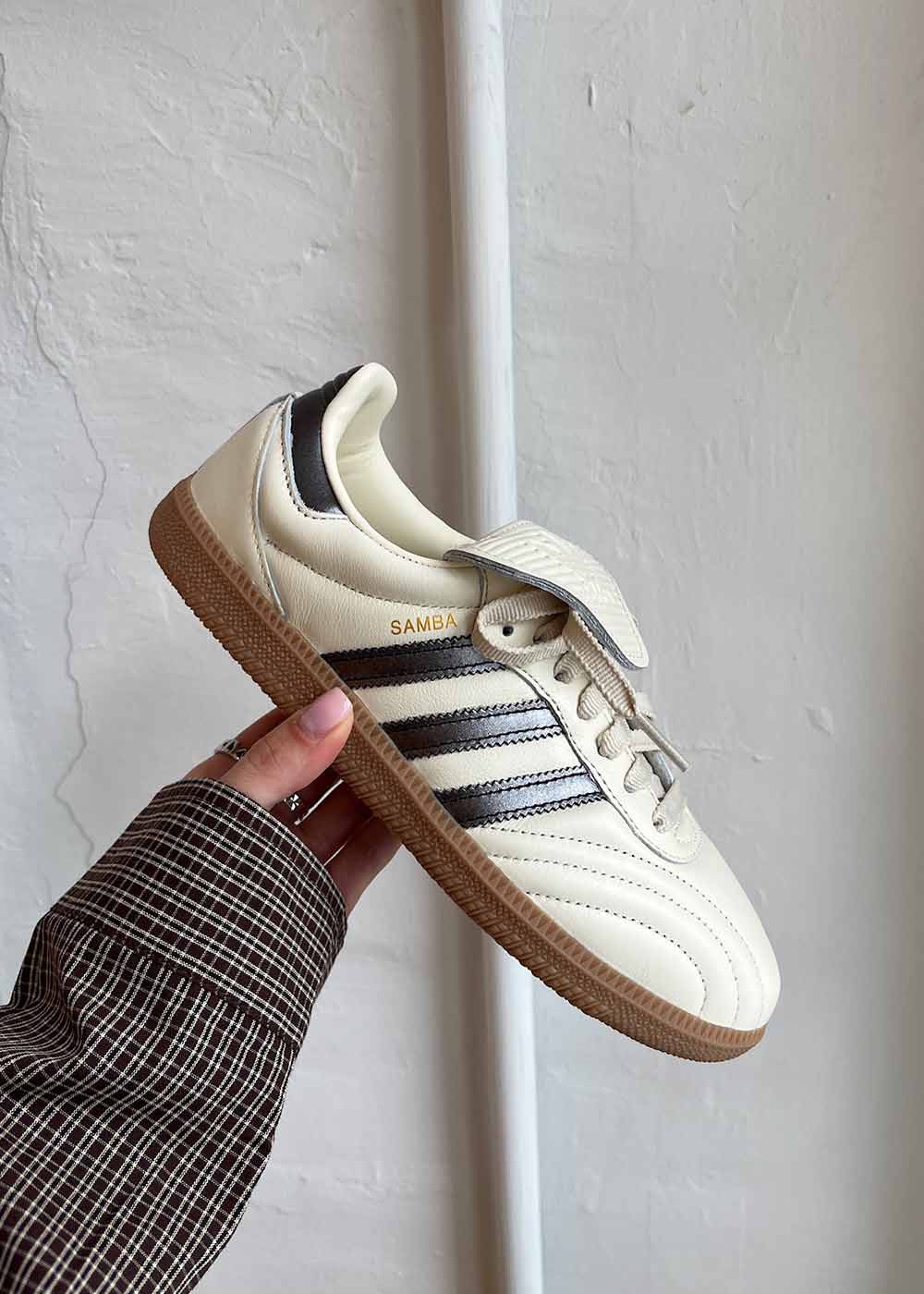 - Kontrastdetaljer i sort på en kremfarget overdel.