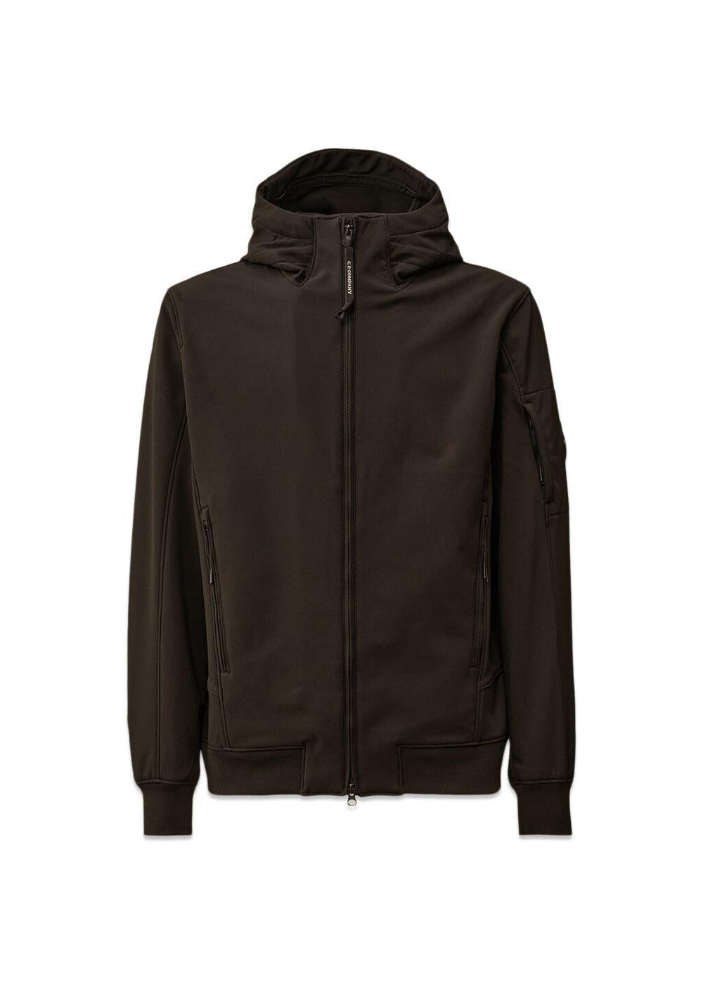 Shell-R Hooded Lens Jacket er en sort vindjakke med høy hals og fast hette. Jakken har et sporty uttrykk med funksjonelle glidelåslommer og de karakteristiske linsene integrert i hetten.