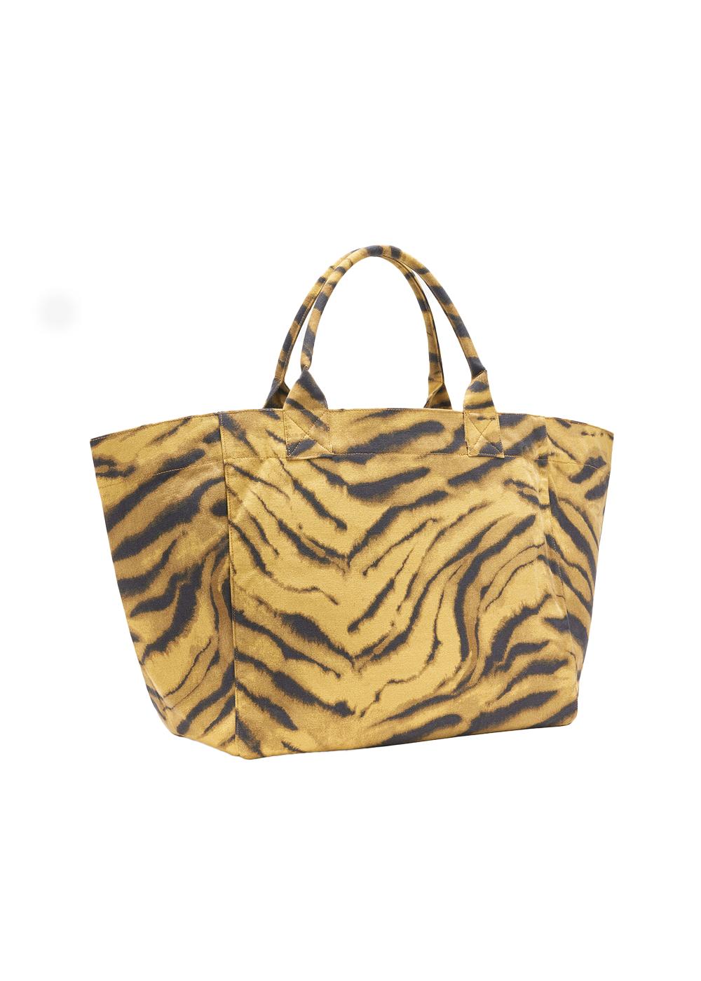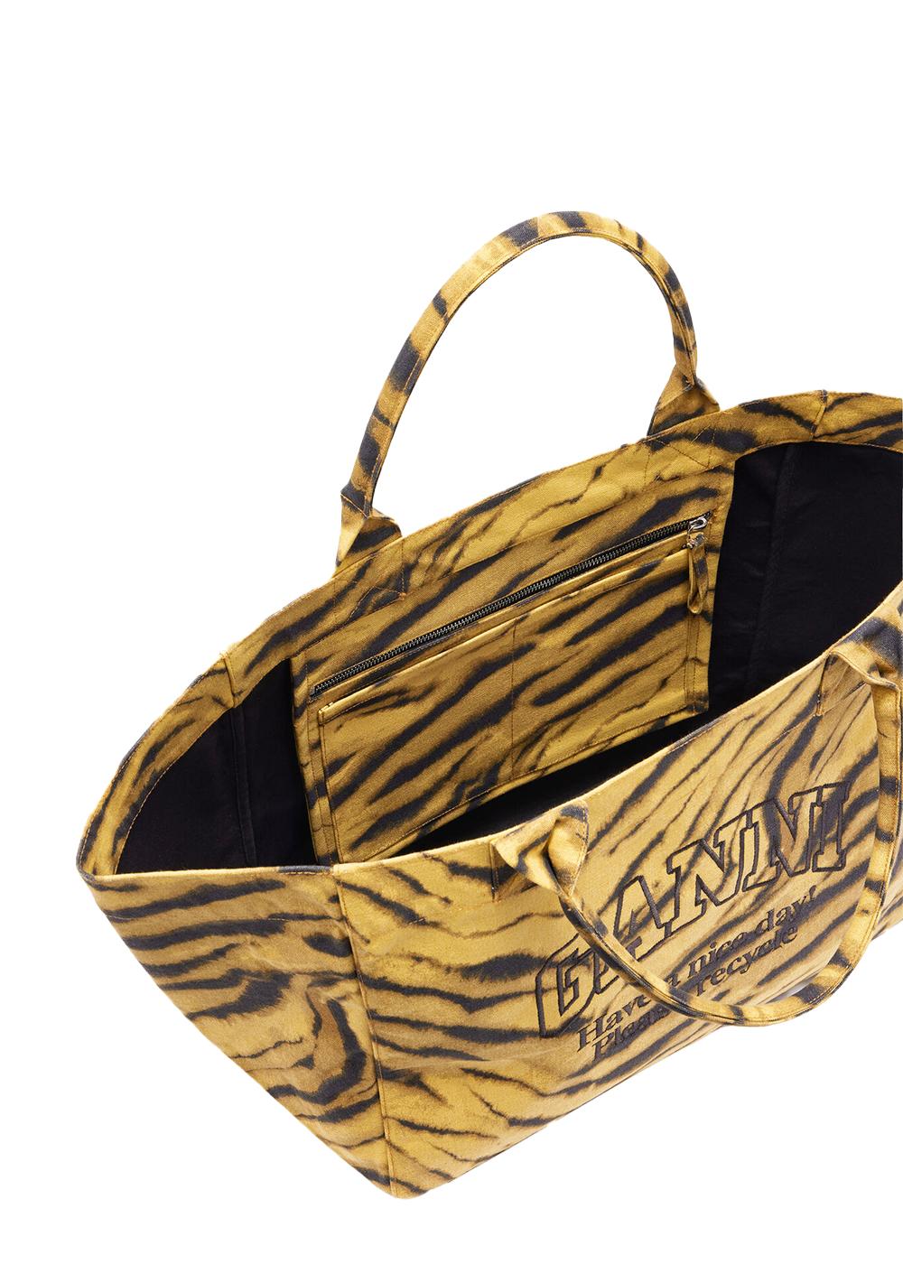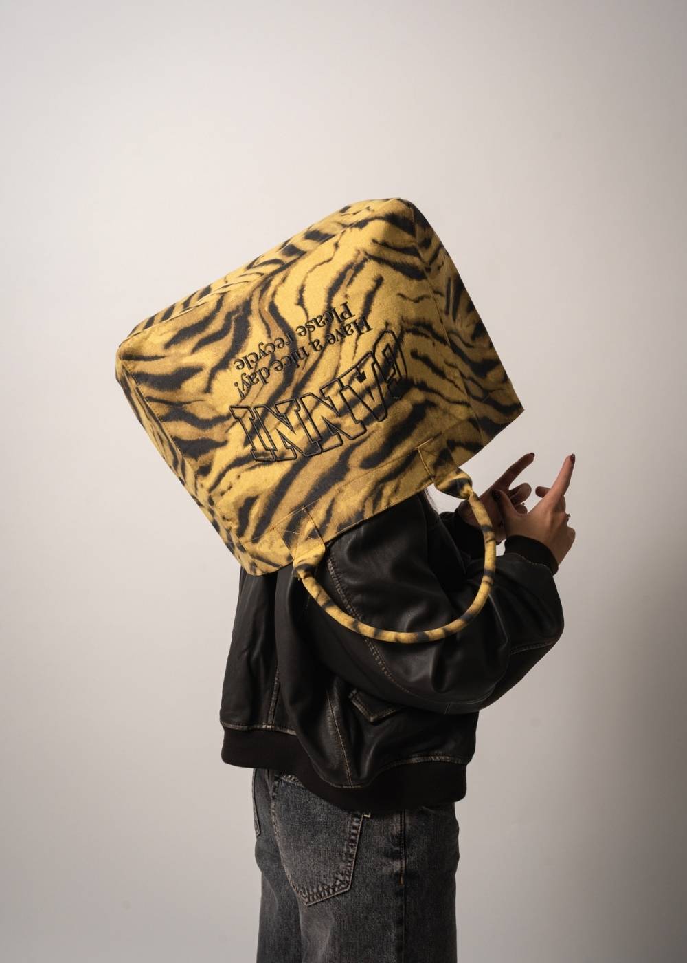 Denne Shopper XXL fra Ganni er en romslig veske med et iøynefallende sebramønster i en khakifarge. Den er designet med en stor Ganni-logo og en karakteristisk tekst på forsiden som gir et unikt uttrykk.