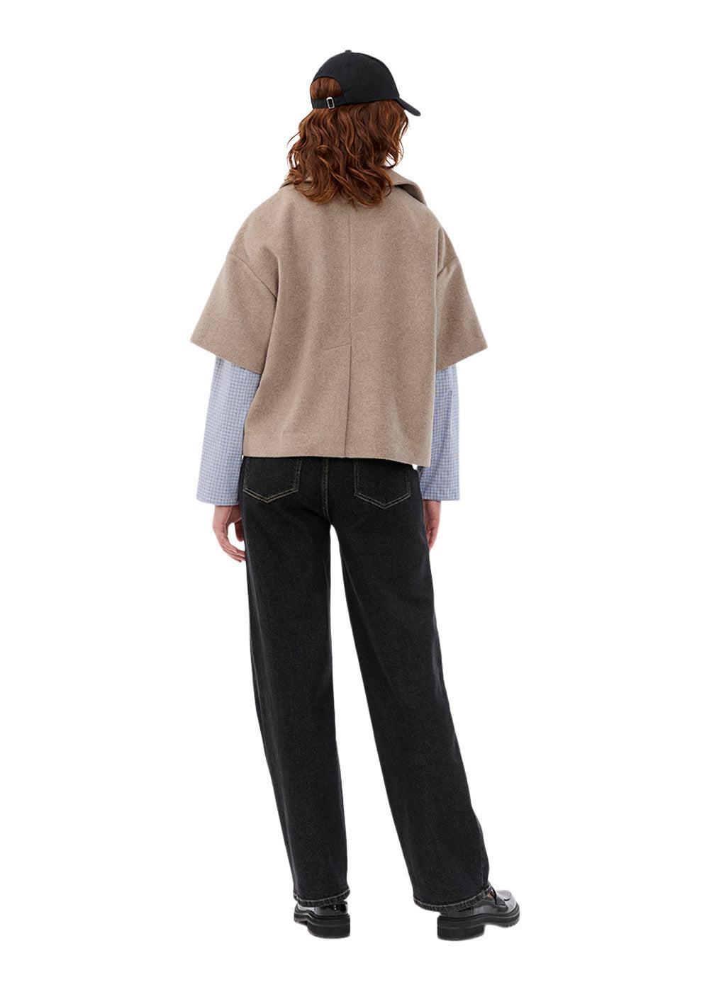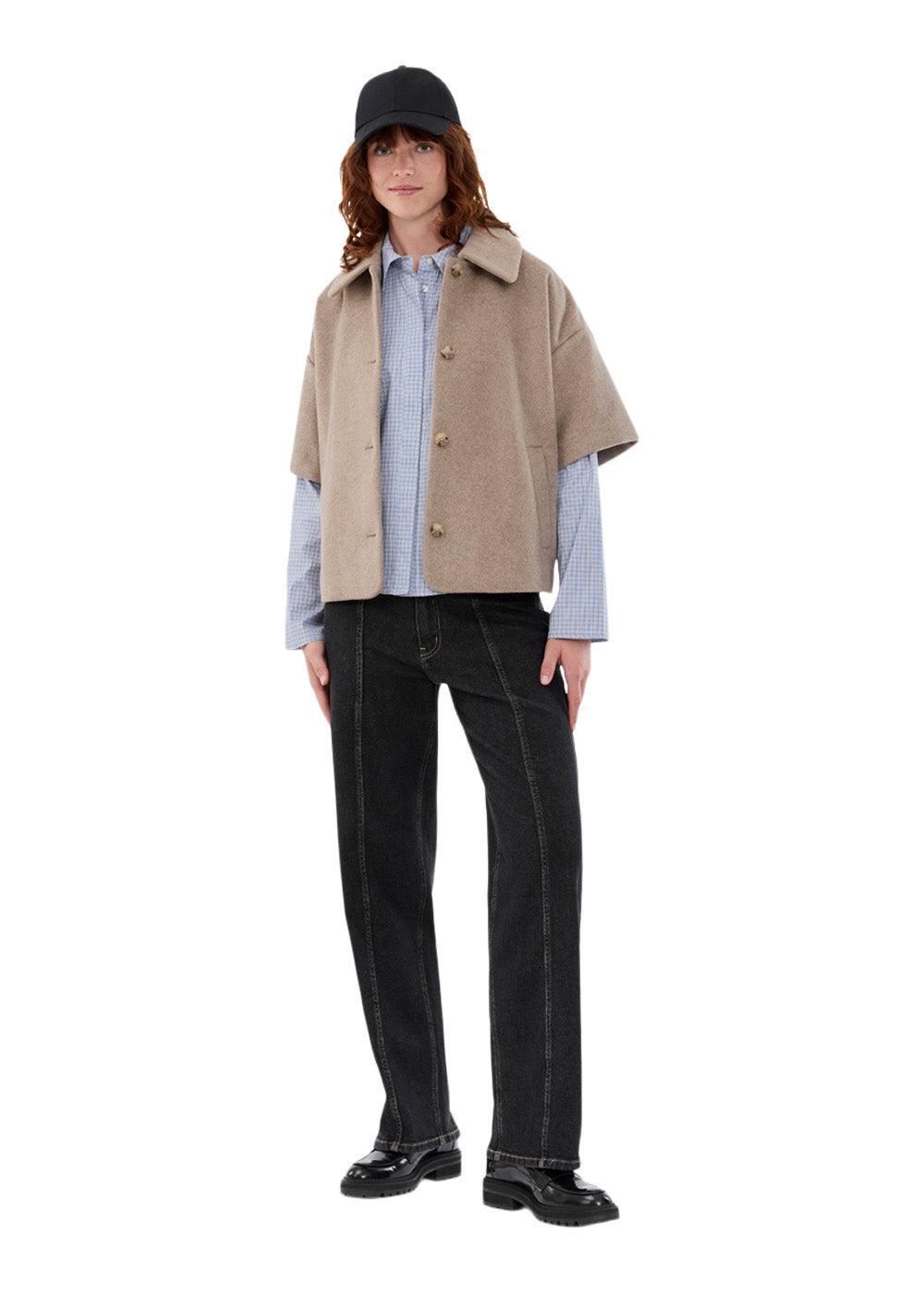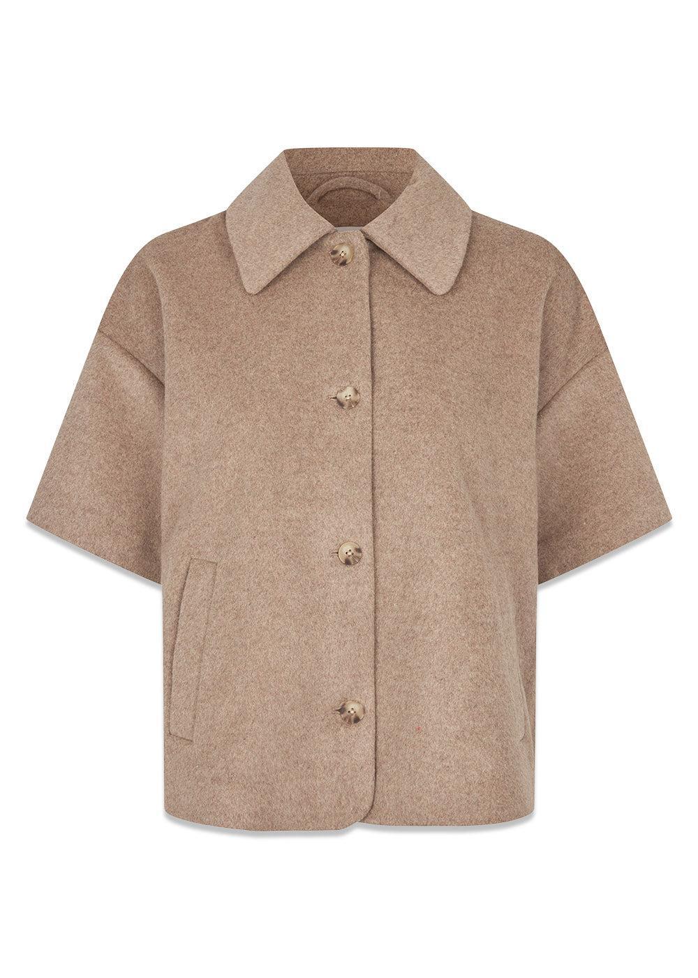 Siljamd cape fra Modström er en stilig overdel i en flott beige melange farge. Den har et moderne design med korte ermer, en klassisk krage og knappelukking, som gir et elegant og avslappet uttrykk.