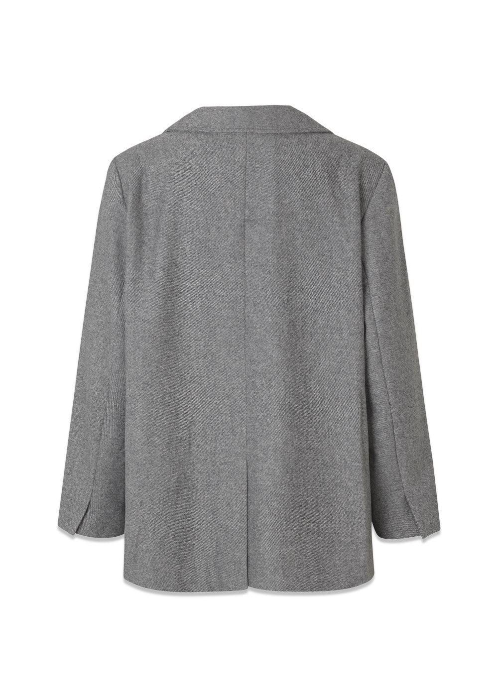Simonmd-jakken fra Modström er en klassisk blazer i en flott gråmelert farge. Den har en enkel knappelukking, lommer foran og et tidløst design som passer til enhver anledning.