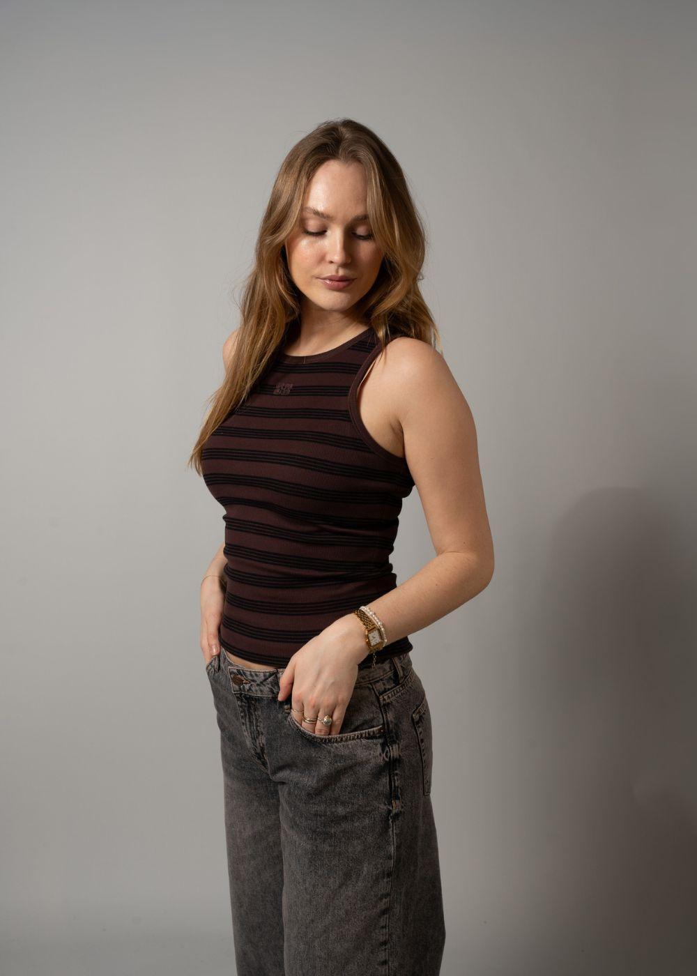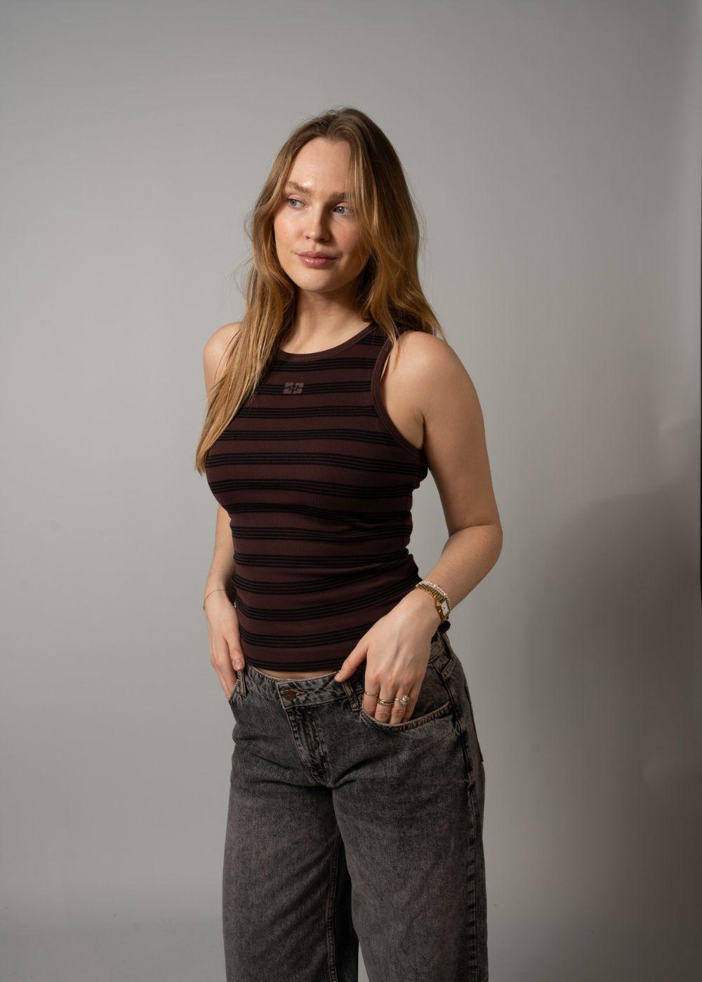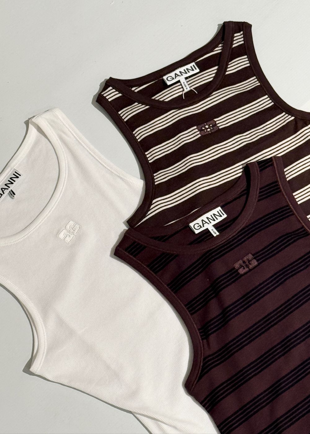 Denne stripete tanktoppen fra Ganni er laget av en myk bomullsribb. Toppen har en tettsittende passform og en brodert logo som gir et diskret Y2K-inspirert uttrykk i fargen Chocolate Plum.