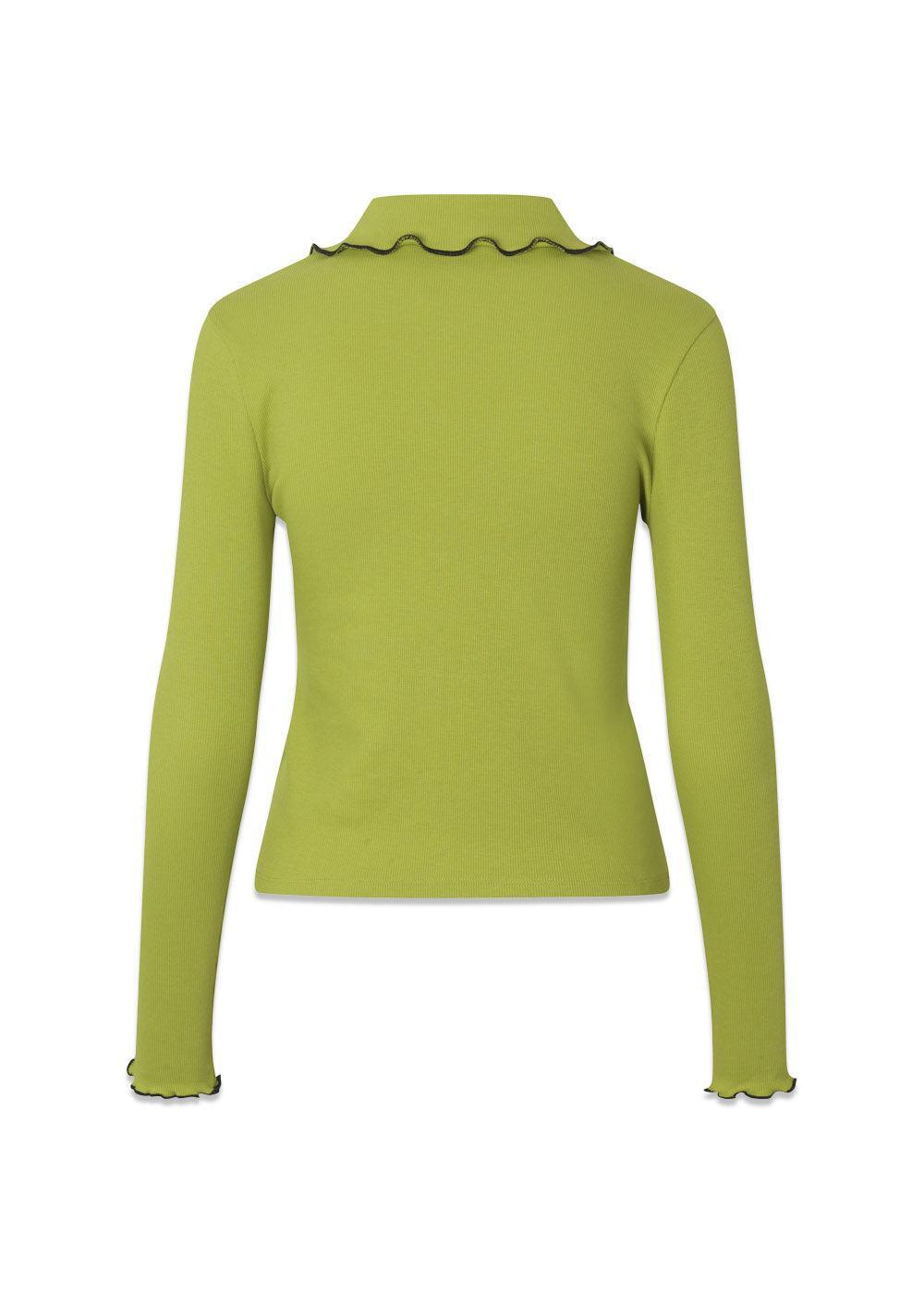 Soleimd LS topp fra Modström er en langermet topp i en frisk limegrønn farge. Den har en fin krage, kontrastknapper og bølgete kanter som gir et unikt Y2K-inspirert utseende.