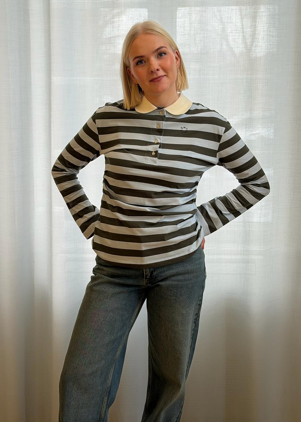 - Krage og ermer: Klassisk polokrage og lange ermer