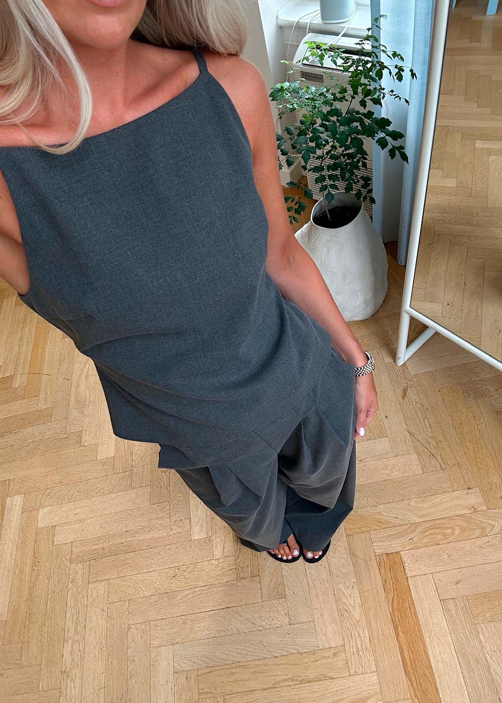Modstrøms klassiske topp i mørkegrå melange kombinerer en elegant båthals med en åpen ryggdetalj. De justerbare spaghettistroppene sikrer en perfekt passform, ideell for både hverdag og festlige anledninger.