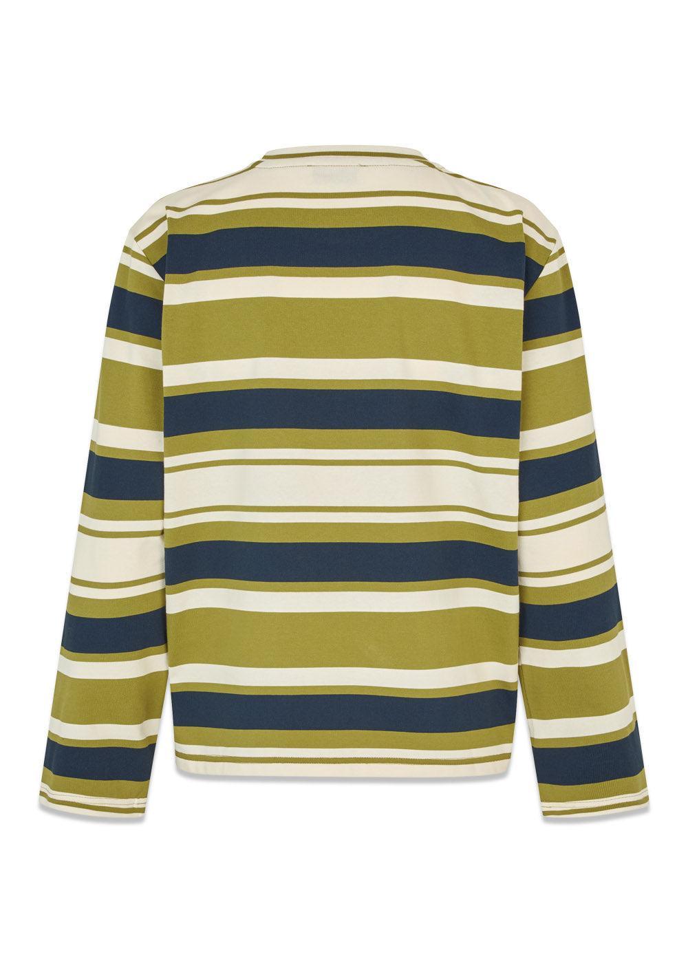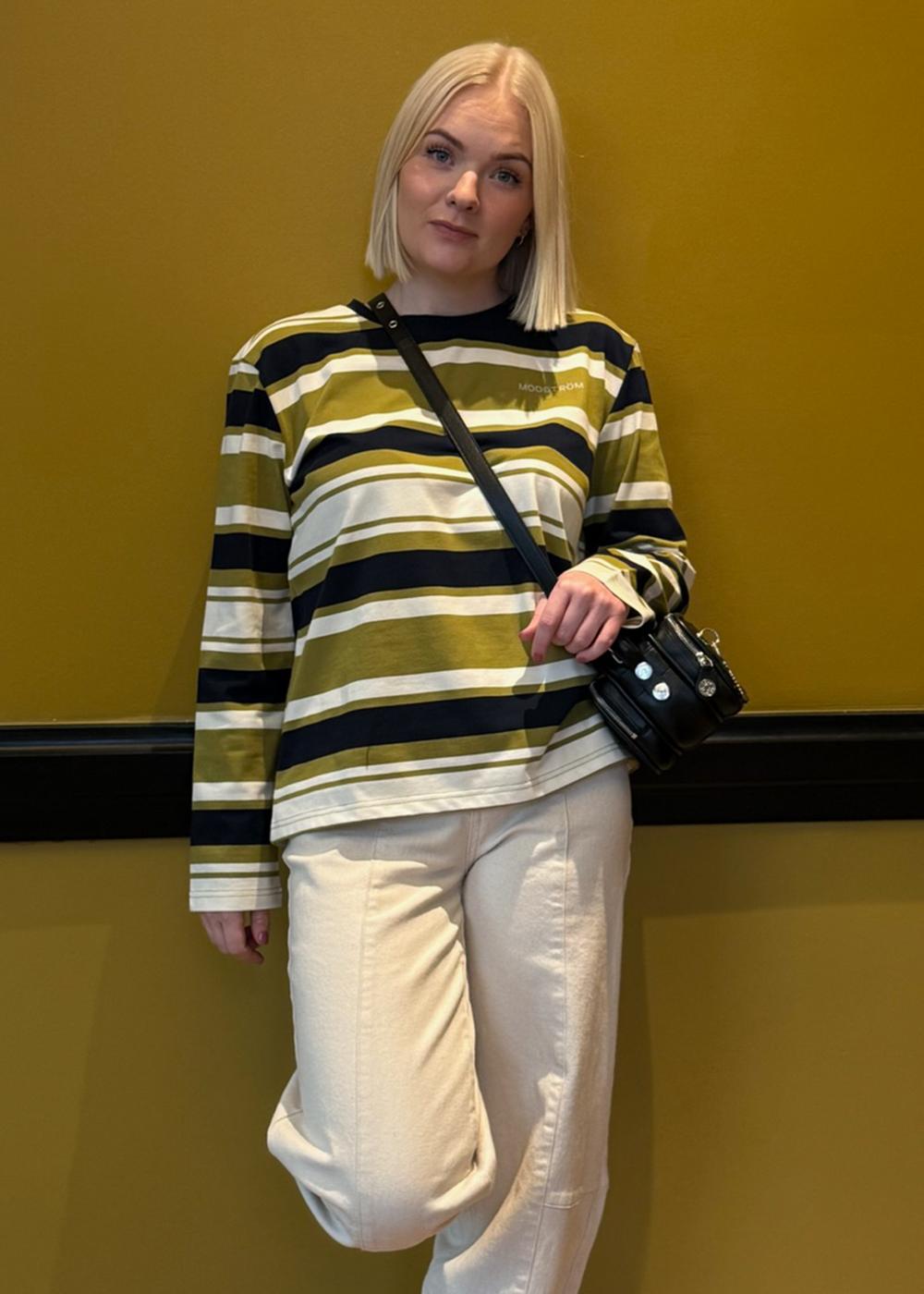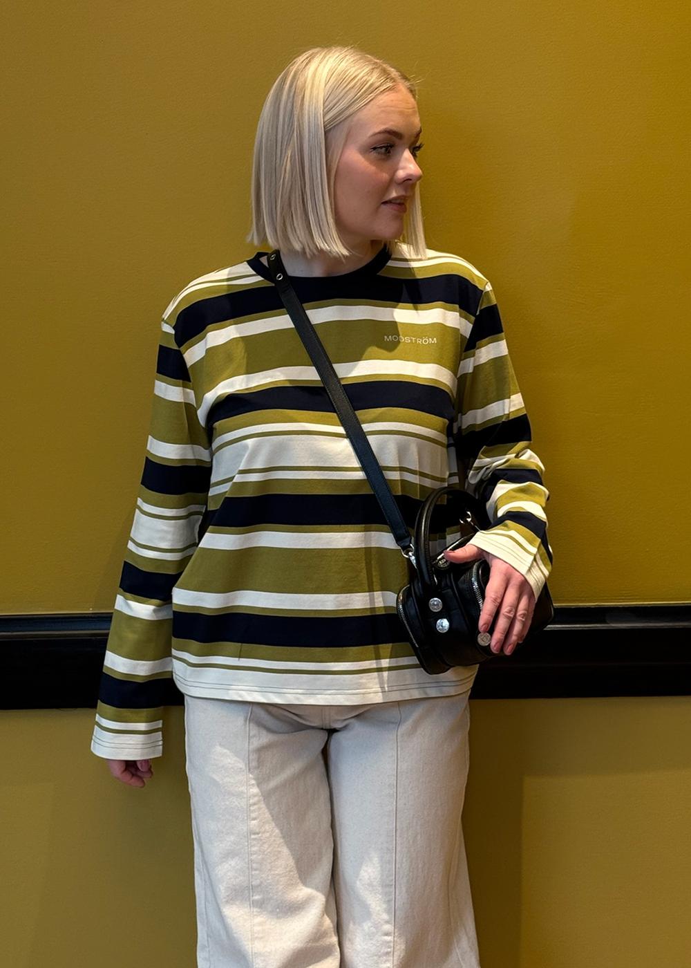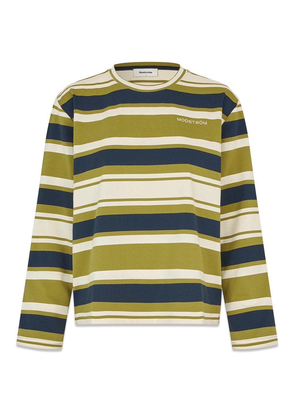 Denne langermede T-skjorten fra Modström har et klassisk, stripete mønster i en flerfarget kombinasjon. Den er designet med en diskret brodert logo på brystet, som gir et stilig og gjenkjennelig uttrykk.