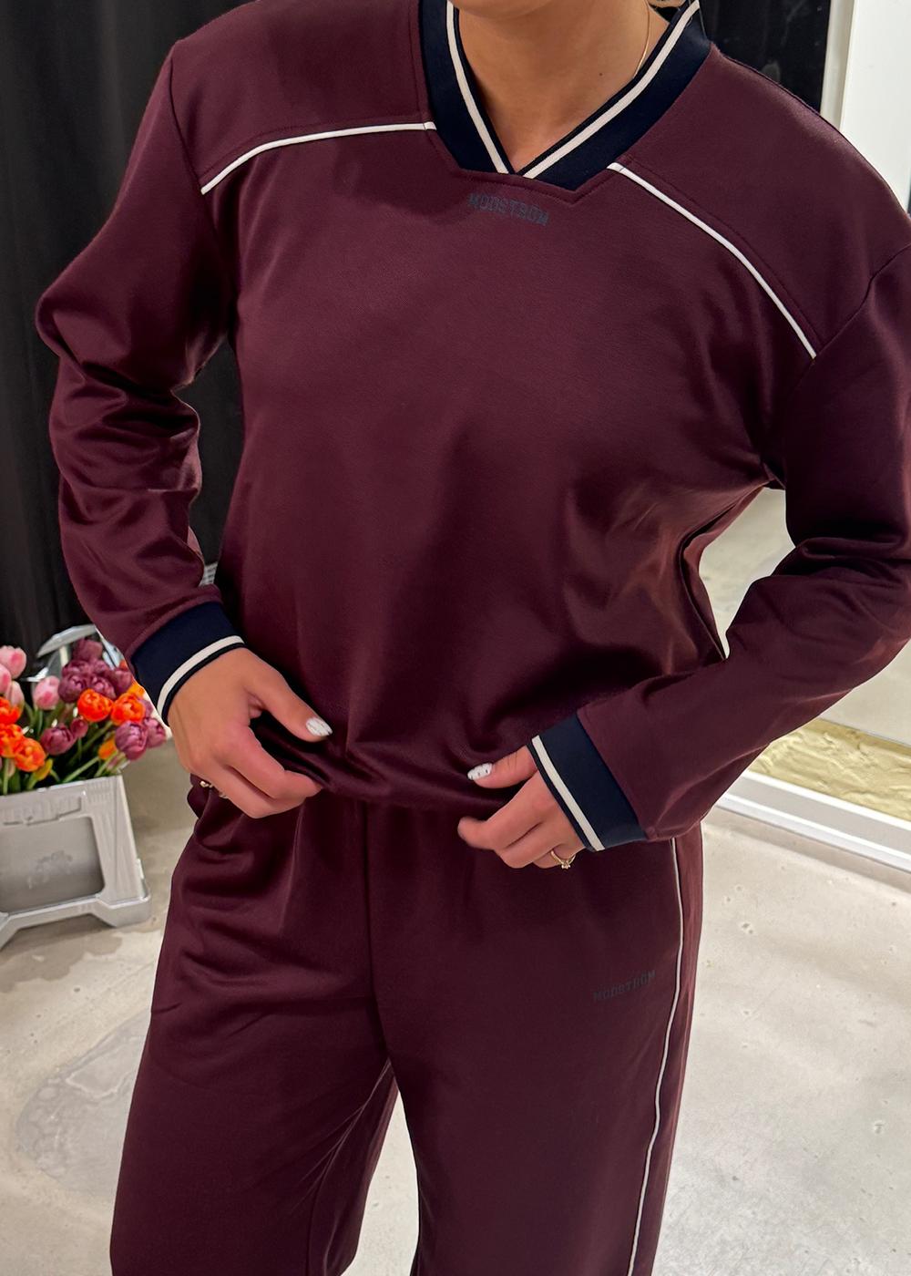 Modströms Utopiamd LS t-skjorte i Wineberry kombinerer komfort og stil med sin avslappede passform og elegante V-hals. Laget av en myk bomulls- og polyesterblanding, er den perfekt for både hverdag og aktiv bruk.