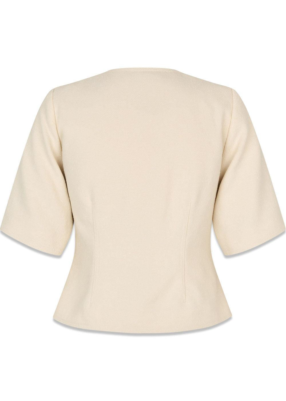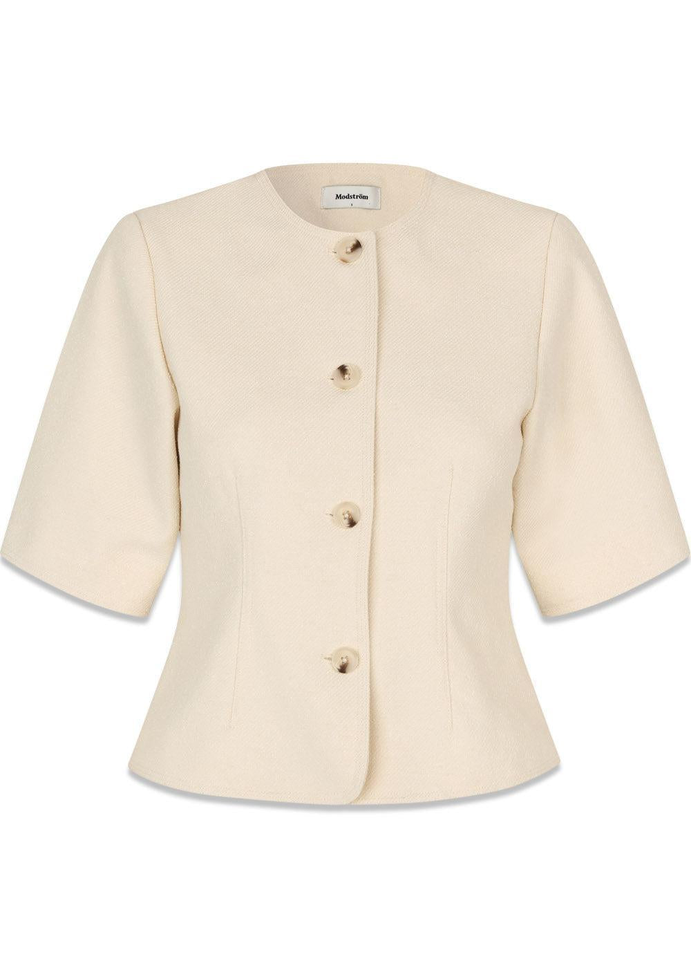 Vesmd-blazeren fra Modström er en stilig, kort blazer i en elegant kremfarge. Den har et retroinspirert design med korte ermer, kontrastknapper og en enkeltspent lukking som skaper et moderne og skarpt uttrykk.